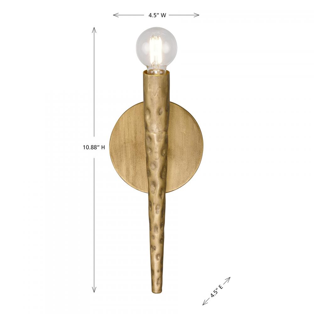 The Savoy House Belleza 1-light sconce was designed by award-winning interior designer and TV host Breegan Jane. Belleza means beauty in Spanish and is an apt description of this sinuous style. A tall, slim arm is crafted from hammered metal and finished by hand in Spumante, a gorgeous gold tone that accentuates the mottled detailing of the metal. Belleza is 10.88" in height, 4.5" in width and extends 4.5" from the wall. It uses one candelabra size bulb of up to 60 watts. Bulb not included. This sconce is damp area rated. This sconce is damp area rated.