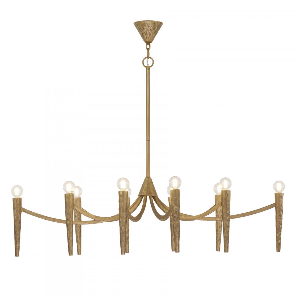 The Savoy House Belleza 10-light linear chandelier was designed by award-winning interior designer and TV host Breegan Jane. Belleza means beauty in Spanish and is an apt description of this sinuous style. Tall, slim arms crafted from hammered metal are finished by hand in Spumante, a gorgeous gold tone that accentuates the mottled detailing of the metal. Belleza is 46" in length, 24" in width and has an adjustable height ranging from 12.63" to 66.63". It uses ten candelabra size bulbs of up to 60 watts per bulb. Bulbs not included. Comes with four 12" downrods and one 6" downrod.