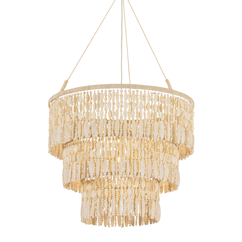 Evoking the natural beauty of the coast, the Ben chandelier features a cascading silhouette with intricate, handmade detailing. Strings of wooden beads form fluid tiers that move gently, creating a dappled lighting effect. A woven abaca wrap ring anchors the design, which is available in two sizes. Vintage Gold Leaf fittings balance the organic textures with a bright detail.