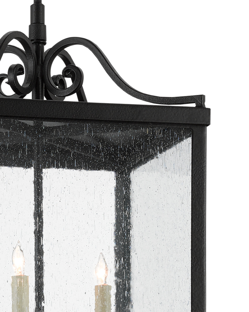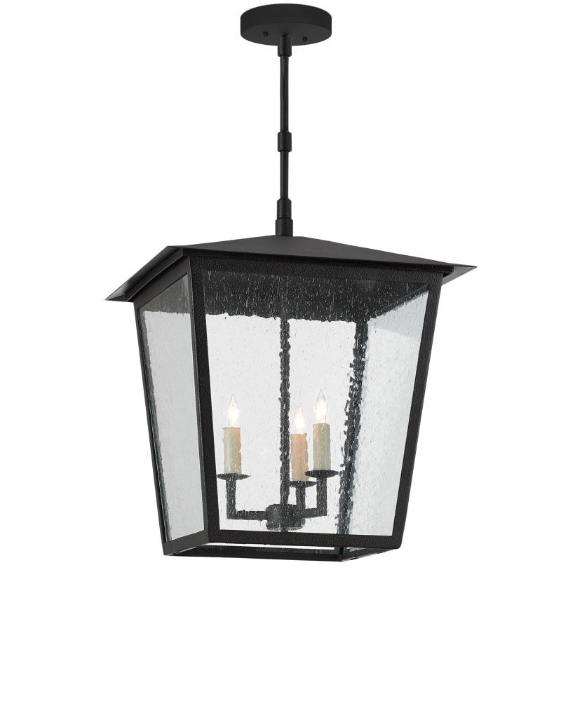 The Bening Large Outdoor Lantern is one of a number of fixtures in our Twelfth Street collection of outdoor lighting that features a Trilux finish, the next generation of high-performance, weather-resistant finishing technology brought to the market exclusively by Currey & Company. The coating provides three levels of protection, and is fade resistant, crack resistant and rust resistant. We guarantee the finishes applied to our Twelfth Street pieces for five years. The metal on this sconce in the collection has been treated to our midnight finish that surrounds seeded-glass panes that turn the illumination to a soft glow.