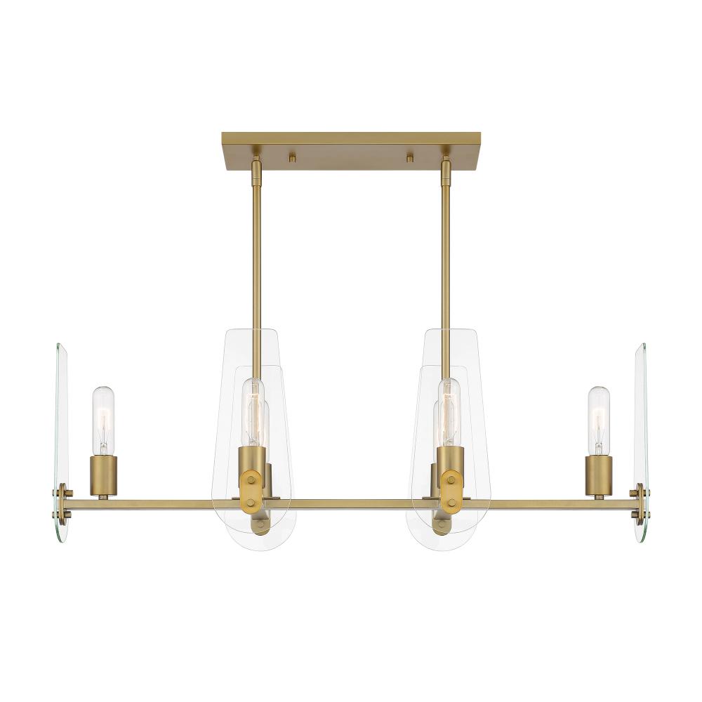 The unique flat Clear Glass shades, Brushed Gold finish, and simple lines create a harmonious balance between Traditional and Modern design sensibilities. The Bergen Beach collection culminates in the elegant and gilded cage of the 8-light chandelier. Made from durable steel for years of enjoyment and illumination.