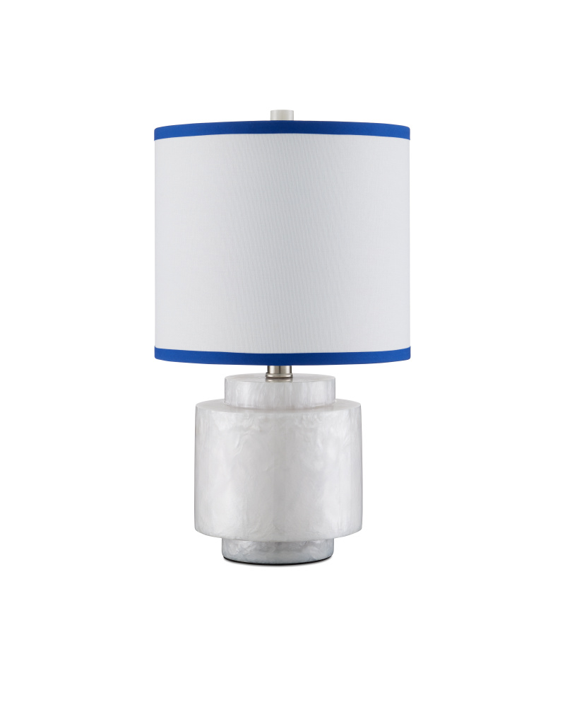 The Beryl White Table Lamp has a luminous geometric body made of composite with a swirling white pattern throughout its composition. The shape is reminiscent of a 1940s design, which brings it a vintage feel, as does the shade trimmed in a matching green.