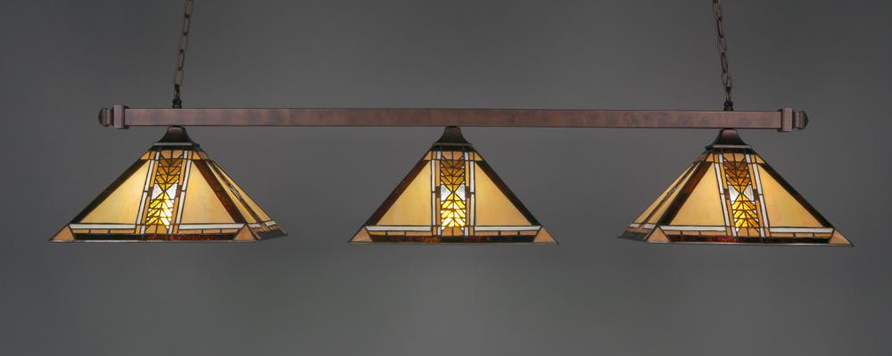 Toltec Lighting 403-BRZ-986 Square 3 Light Bar With Square Fitters Shown In Bronze Finish With 14 Santa Cruz Art Glass