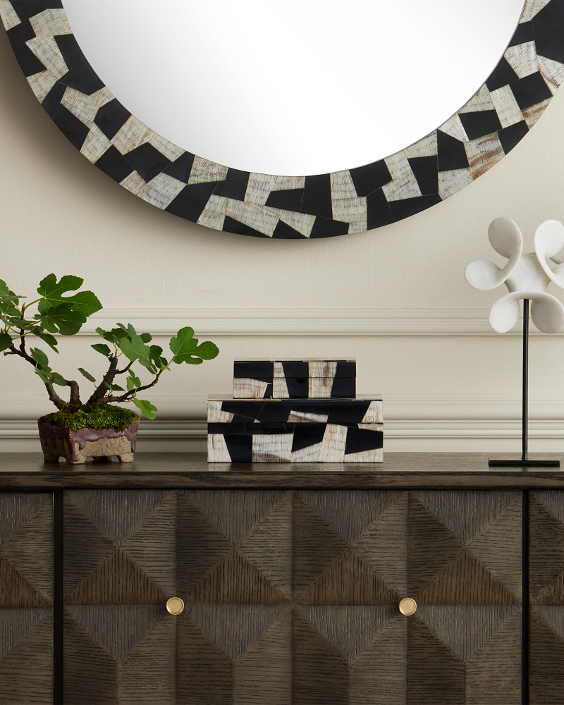 The Bindu Box Set is a modernist-inspired accent for any space. Made of pieces of black composite and buffalo horn, which is chiseled to bring the surface added texture, the ivory and black decorative boxes make a statement wherever they are placed. The interiors are lined with linen, and both large and small boxes have a felt bottom to complete the feeling of fine detailing.