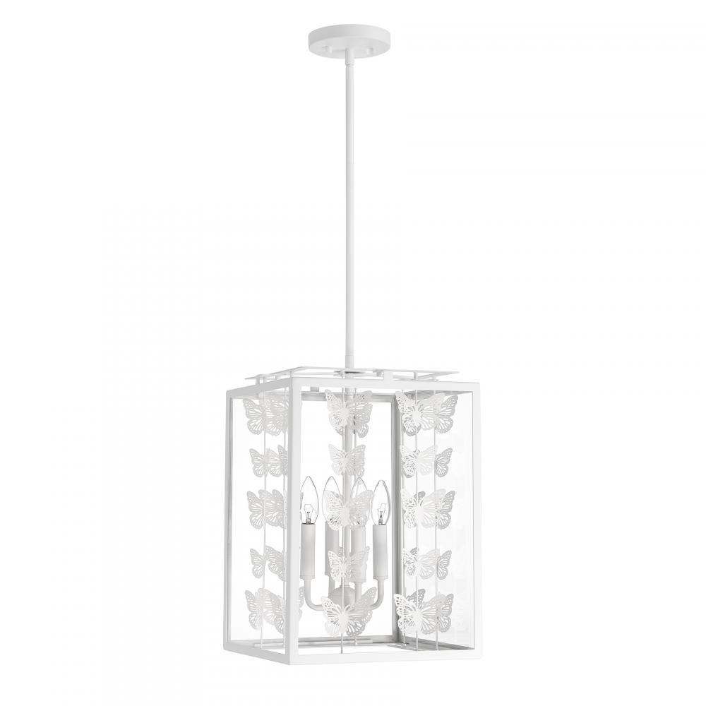 Add a little magic to any room with the whimsical Savoy House Birch 4-light pendant, which features a geometric structure adorned with rows of lovely metal butterflies finished in Bisque White. Clear glass panes frame everything beautifully. Birch is 12" in width and has an adjustable height ranging from 17" to 71". Comes with four 12" downrods and one 6" downrod. Uses four candelabra size bulbs of up to 60 watts per bulb. Bulbs are not included.