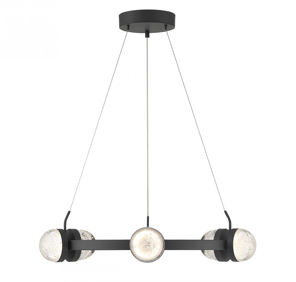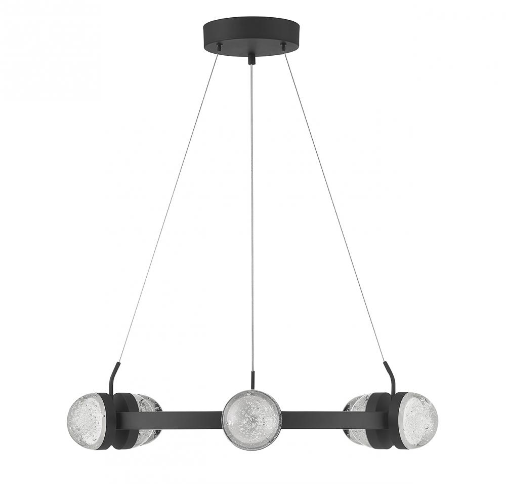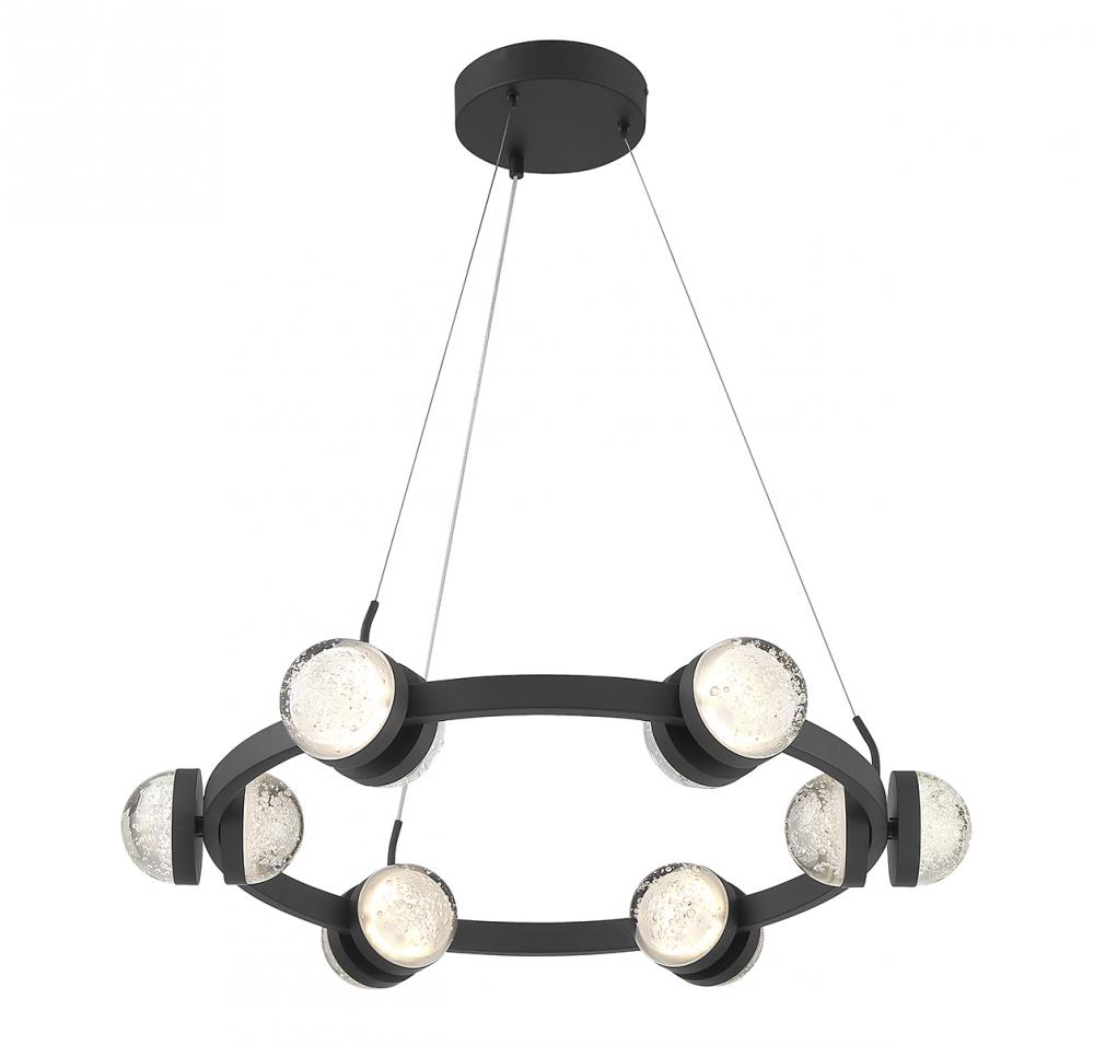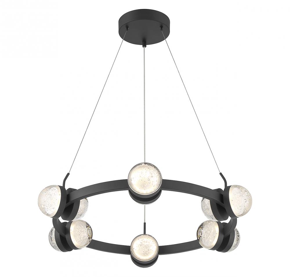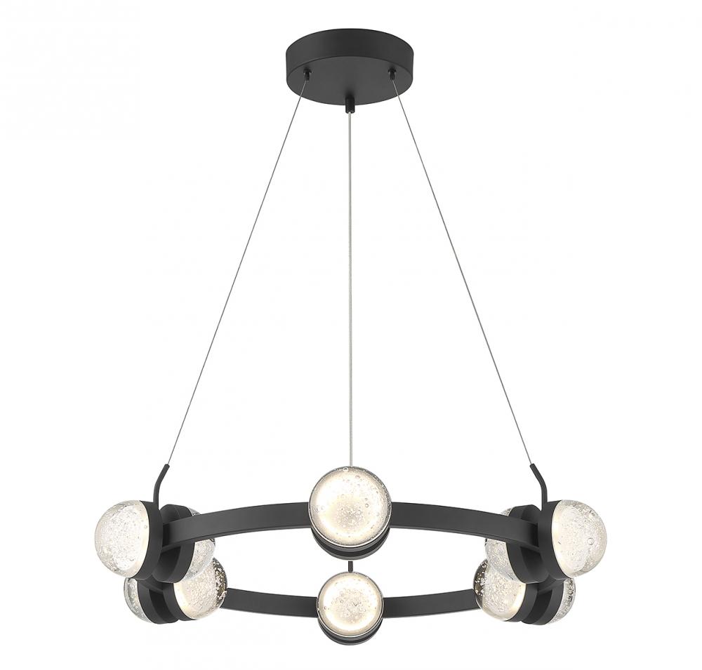 Go big and bold with the Savoy House Biscayne 12-light chandelier! Its design is studded with half-moons of bubble glass that, when illuminated by the integrated LED lights, gives off an intriguing glow. Finished in matte black. Biscayne is 28" in width and has an adjustable height ranging from 6.5" to 120".