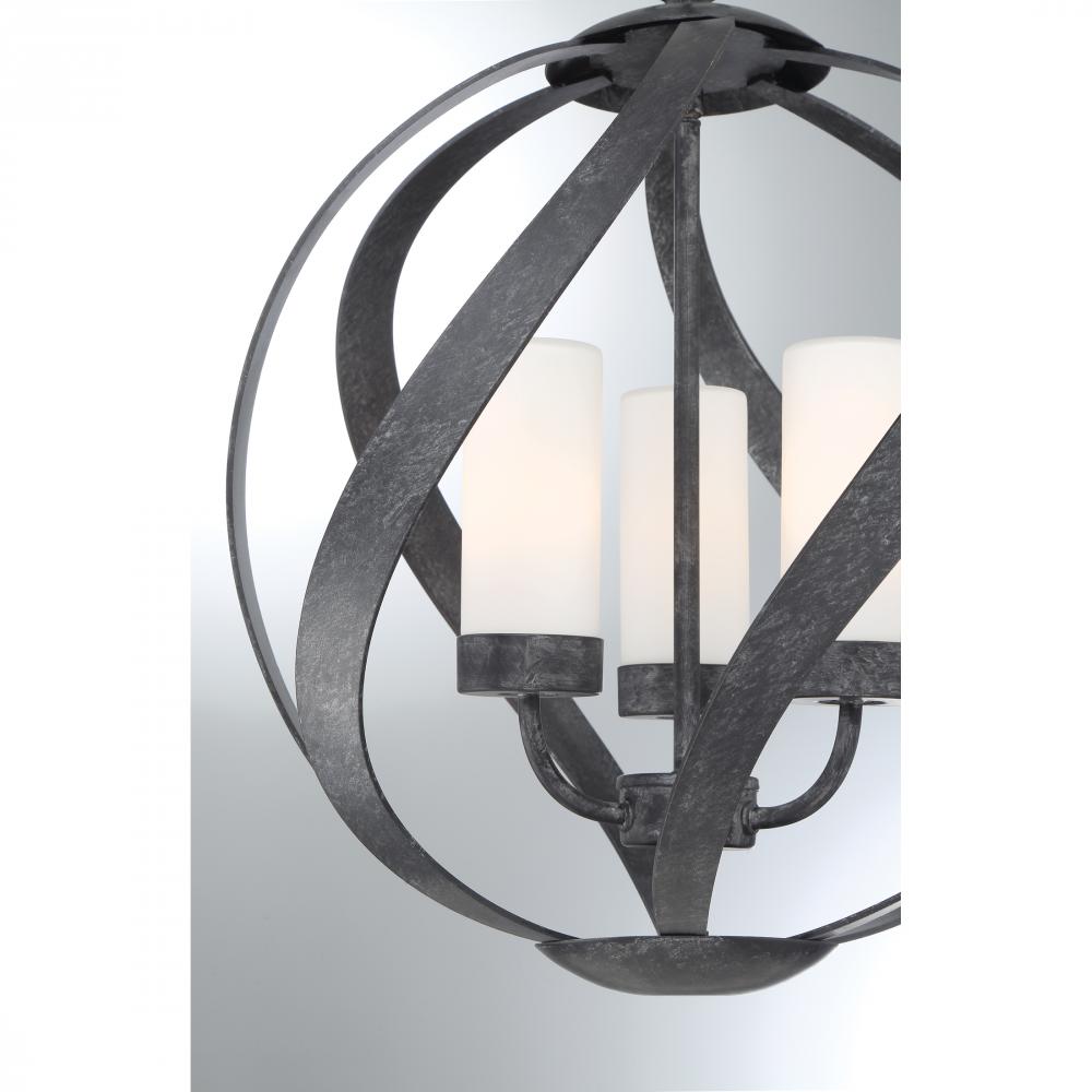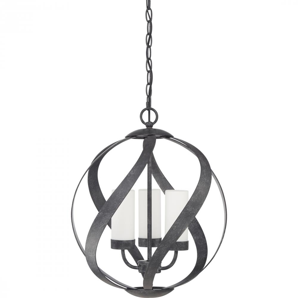 Bold yet graceful, the Blacksmith pendant fuses strength and artistry into a single striking form. Sweeping bands in an earth black finish twist into a sculptural sphere, cradling opal etched glass shades that glow like candlelight through rain-kissed wind