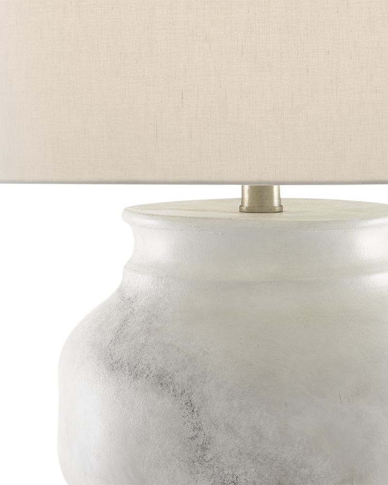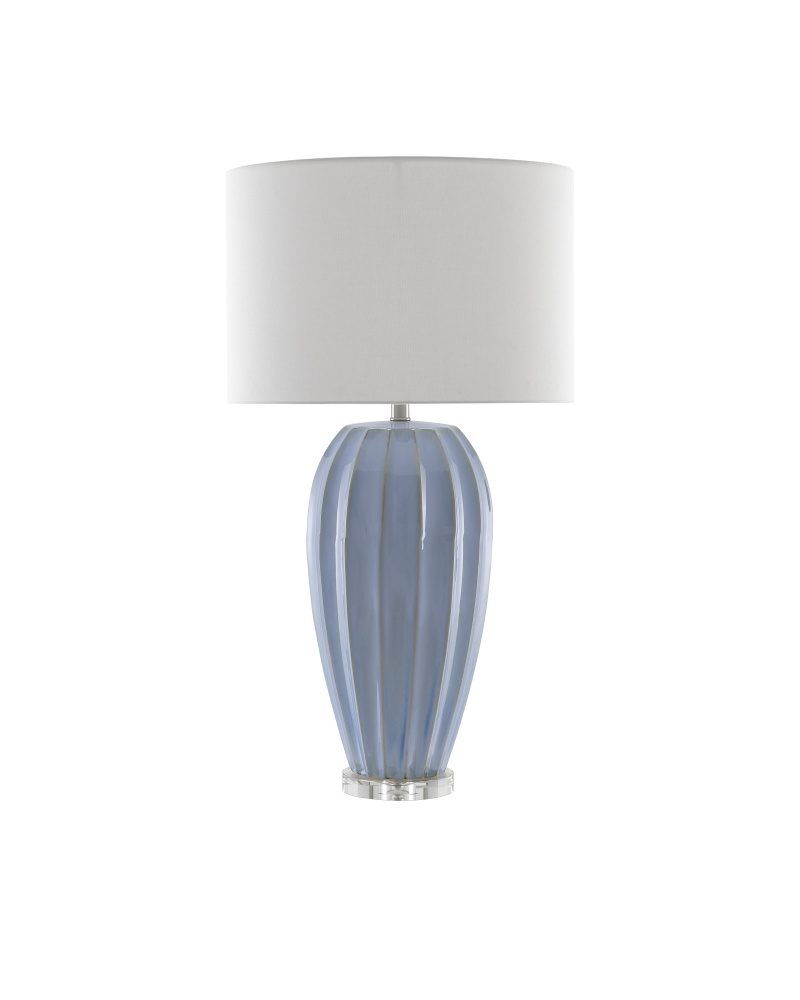 Made of porcelain, the Bluestar Table Lamp has a beautiful ridged surface with distressing at its thickest points. The cornflower blue lamp sits atop a clear optic crystal base and is topped with a white shantung shade.