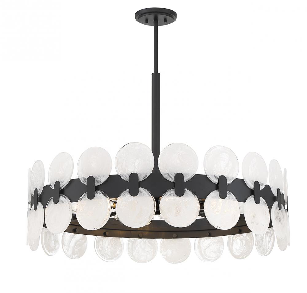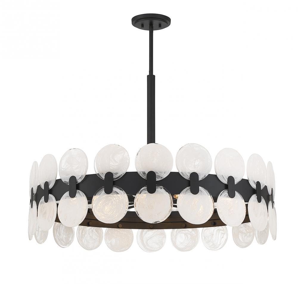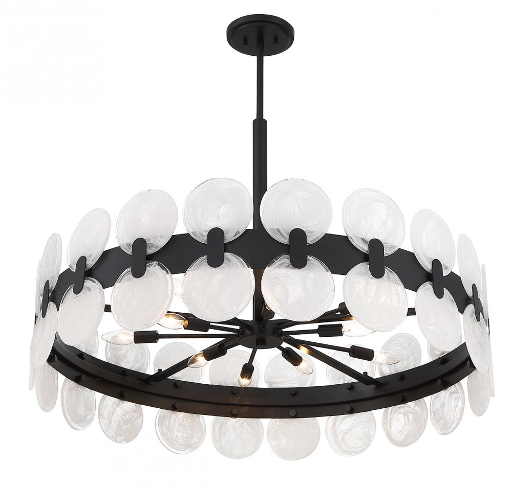 The Savoy House Boca 10-light chandelier skillfully combines a curving frame with soft organic touches to create a light that is truly the best of both worlds. The open structure is adorned with disks of strie piastra glass that feature mesmerizing swirling patterns. The beautiful wisps of white in the glass pair up perfectly with the fixture's matte black finish. Boca is 35.5" in width and has an adjustable height ranging from 25.5" to 79". Comes with four 12" downrods and one 6" downrod. Uses 10 candelabra size bulbs of up to 60 watts per bulb (bulbs not included).