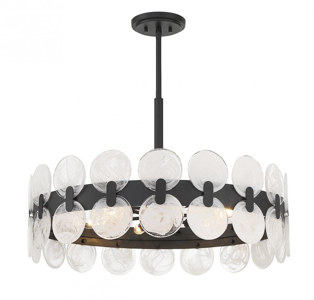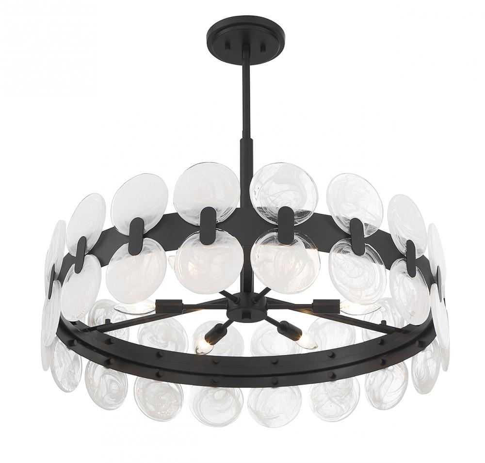 The Savoy House Boca 6-light chandelier skillfully combines a curving frame with soft organic touches to create a light that is truly the best of both worlds. The open structure is adorned with disks of strie piastra glass that feature mesmerizing swirling patterns. The beautiful wisps of white in the glass pair up perfectly with the fixture's matte black finish. Boca is 27.5" in width and has an adjustable height ranging from 18.5" to 72". Comes with four 12" downrods and one 6" downrod. Uses 6 candelabra size bulbs of up to 60 watts per bulb (bulbs not included).