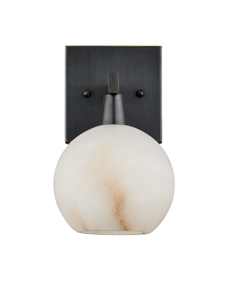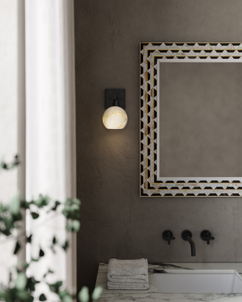 The Bombelles Bronze Wall Sconce was designed to spread abundant light over a bathroom counter; the sconce joining others in the Bath Collection. The globe will be luminous when it is lit, as it is made of natural alabaster, and the oil-rubbed bronze finish on the metal adds warmth to the design. Alabaster is a natural material, so there will be slight variations in each of the fixtures. The Bombelles can be mounted with the globe pointing up or down.
