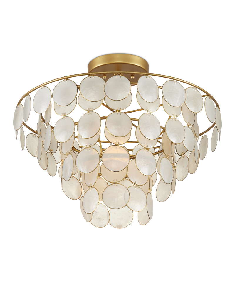 The Bon Vivant Small Semi-Flush Mount was designed to be ethereal in its make-up. The discs that effervesce with illumination are made of Capiz shells ringed with a decorative metal edge. These match the contemporary gold finish on the rest of the fixture. The thinness of the wires that fasten the discs to the frame and to each other is a sophisticated design detail. This gold semi-flush is convertible to a chandelier when the lower canopy is removed. Adjustable from 23.25" to 91.25" with use of included chain/rod kit/cable. If your space calls for a longer drop, additional chain/rods/cable is available for purchase.