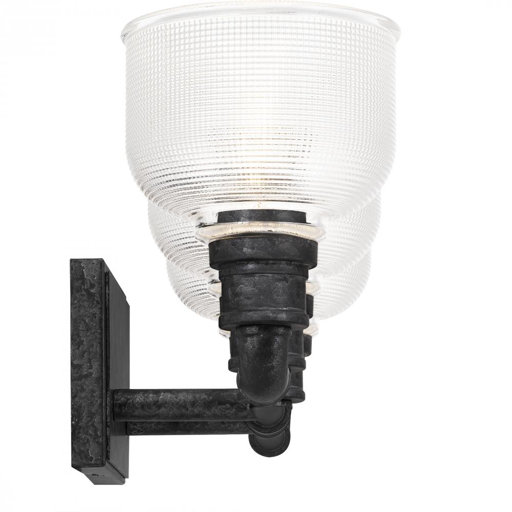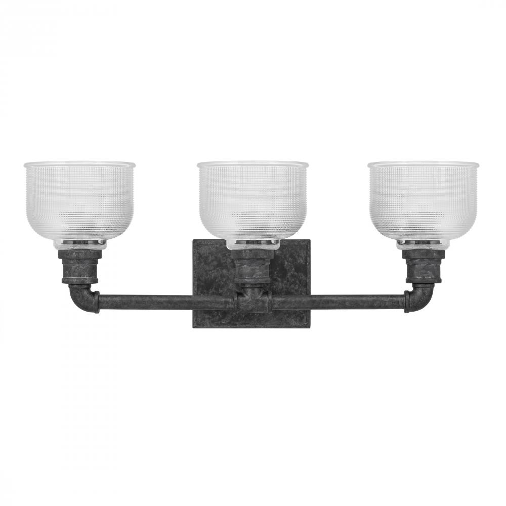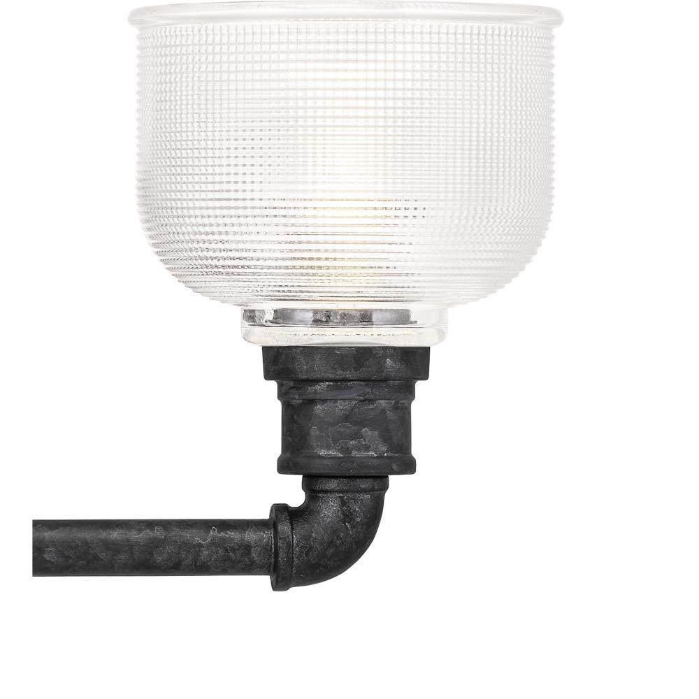 The Boomer collection is a must-have for rustic and industrial spaces alike. The pipe-inspired silhouette, finished in Old Black, creates a bold presence in any bathroom. Clear prismatic glass shades add a hint of additional flair while conveying just the
