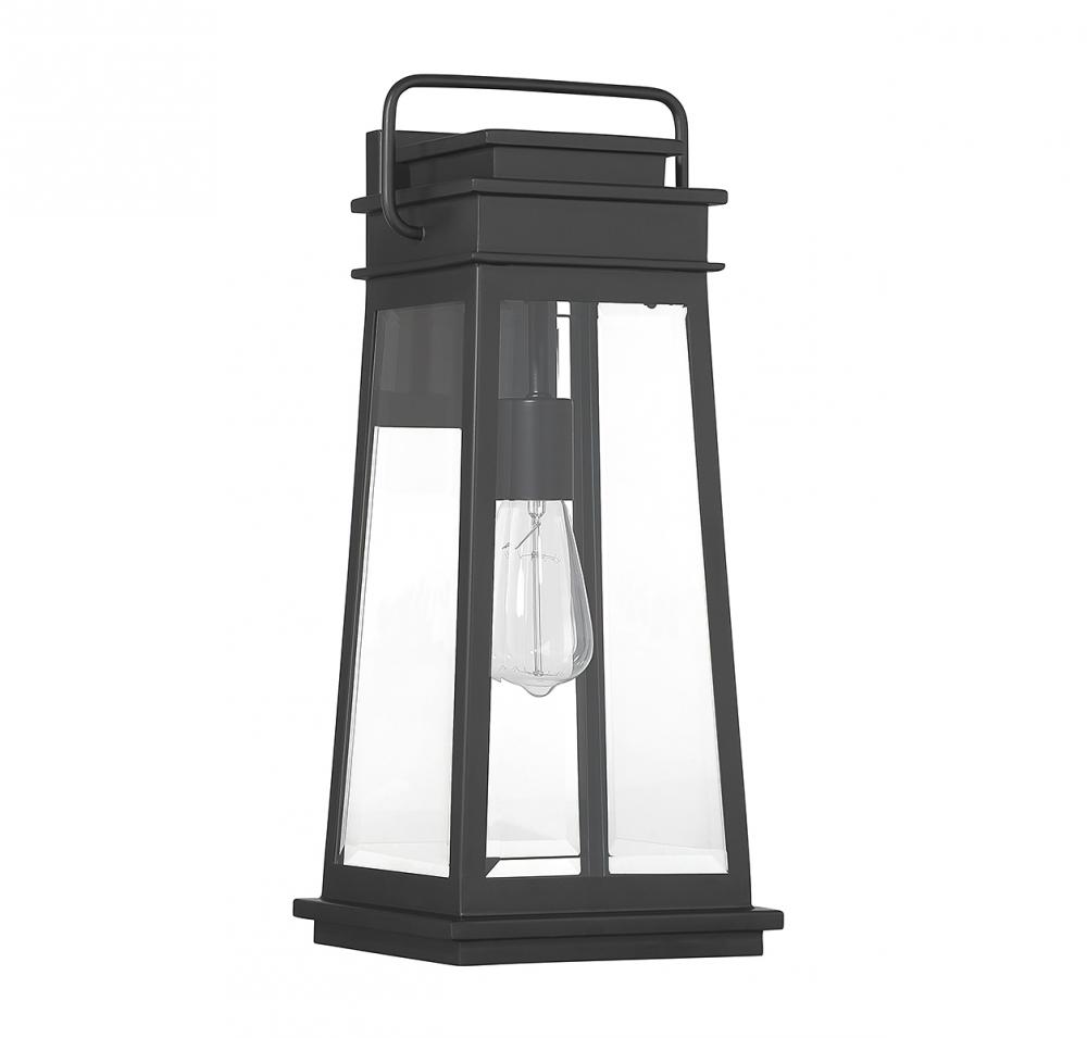 The Savoy House Boone 1-light outdoor wall light showcases a classic lantern-style lighting look with panes of clear beveled glass and a matte black finish that adds versatility. Boone is 20" in height, 8.25" in width and extends 8.5" from the wall. It uses 1 standard size bulb with a max of 60 watts (bulb not included).