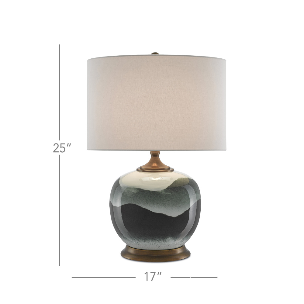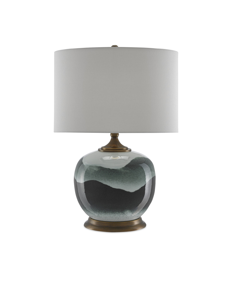 A piece that can complement a variety of settings, the Boreal Table Lamp evokes feelings of mountainous wood or the waves of a stormy North Sea. The undulating pattern is created by varying shades of green glaze that have been applied to its buxom porcelain jar-like body. The metal has been treated to an antique brass finish for added warmth and the lamp is topped with a white linen shade.
