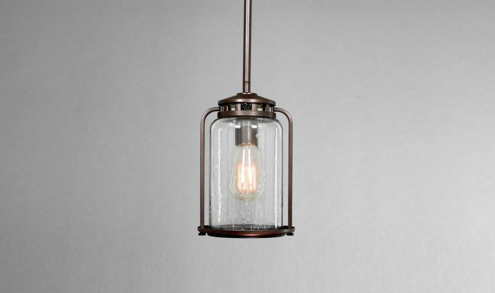 The one-light small hanging lantern from the Botta Collection provides a casual feel to complement interiors and exteriors with vintage flair. Finely crafted accents highlight clear seeded glass.