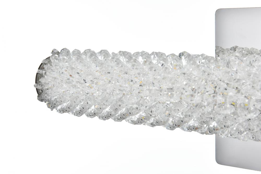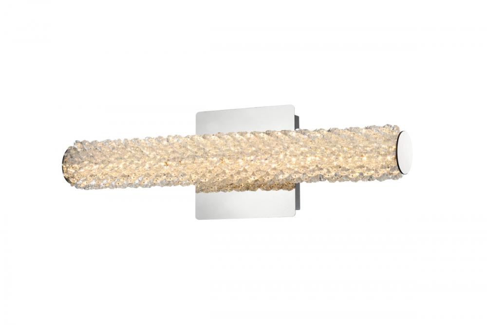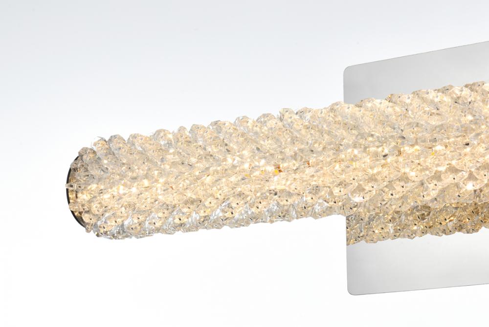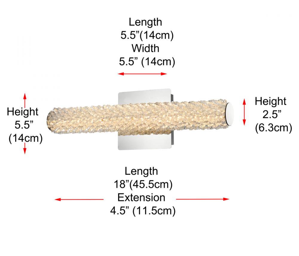 Illuminate your space with this exquisite crystal wall sconce, boasting a sleek and horizontal cylindrical design measuring 18 inches with a 5.5 inch backplate.