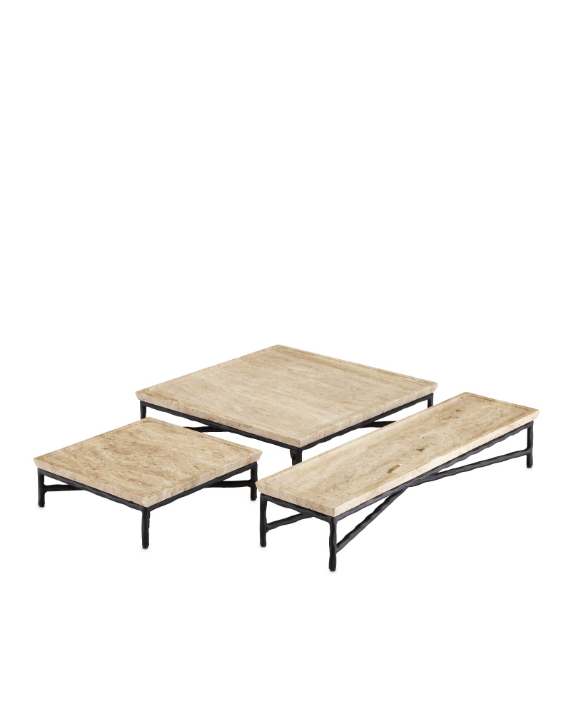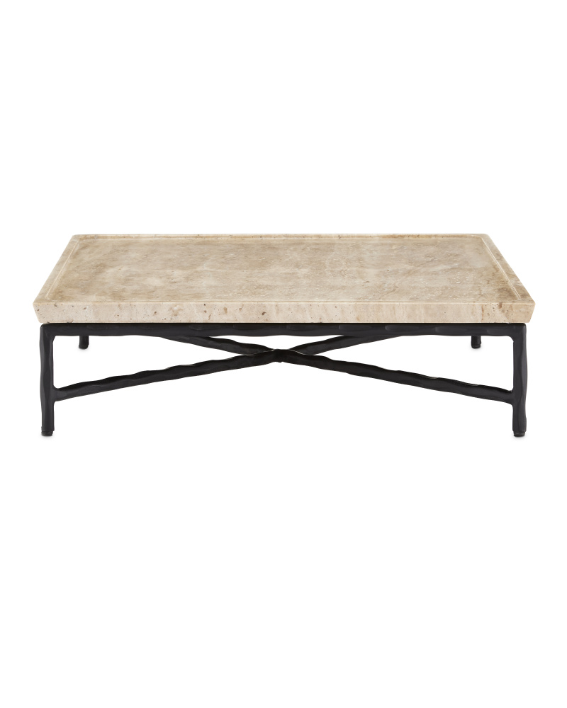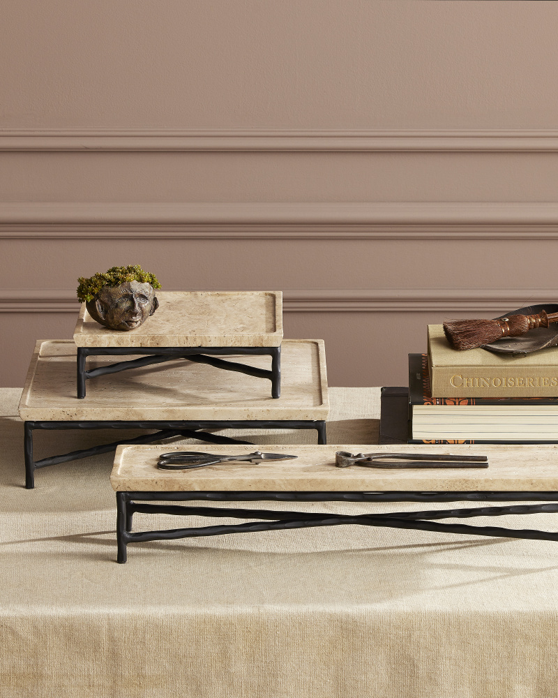 The Boyles Large Travertine Tray has a forged iron base in a black finish that holds a tray top made of solid, unpolished travertine. The personality of the surface stems from the fact that it is porous and has a variety of nooks and crannies in its pitting. Inherent variations in the stone's texture, veining, and color - from pale ivory to a warm tan - are to be expected and celebrated. Each surface is unique so no two are exactly alike.
