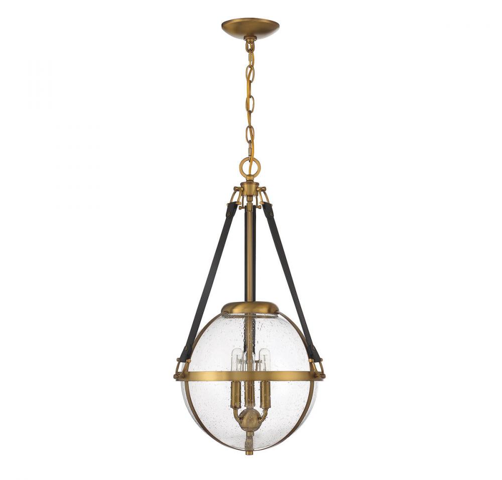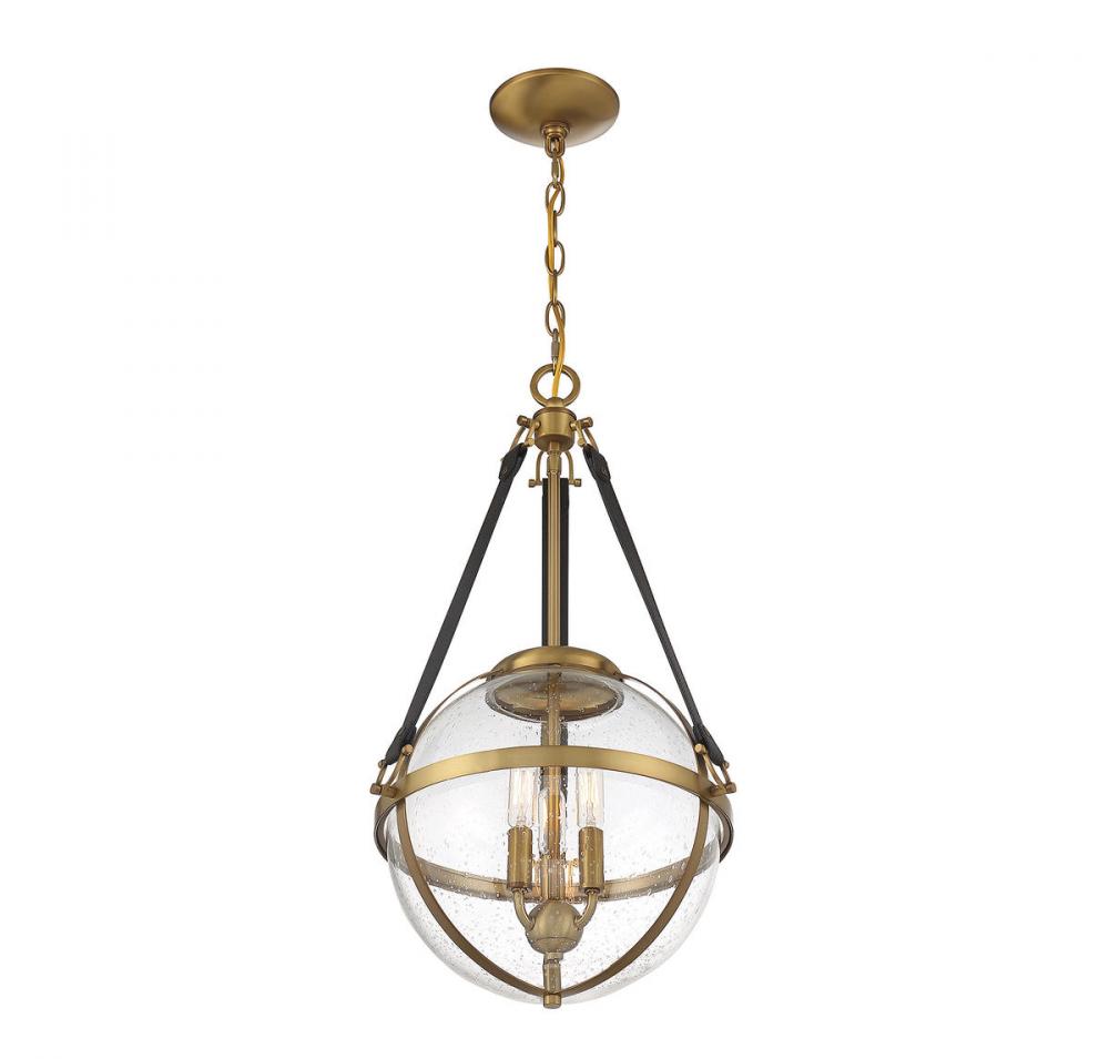 The Savoy House Bozeman 3-light pendant is a design that brings a touch of refined, equestrian-inspired style to your home. A seeded glass orb is held in place with straps of chocolate leather that pair perfectly with the warm brass finish. Bozeman is 25" in height and 14" in width. It uses three candelabra size bulbs of up to 60 watts per bulb. Comes with 120" of chain and 144" of cord.