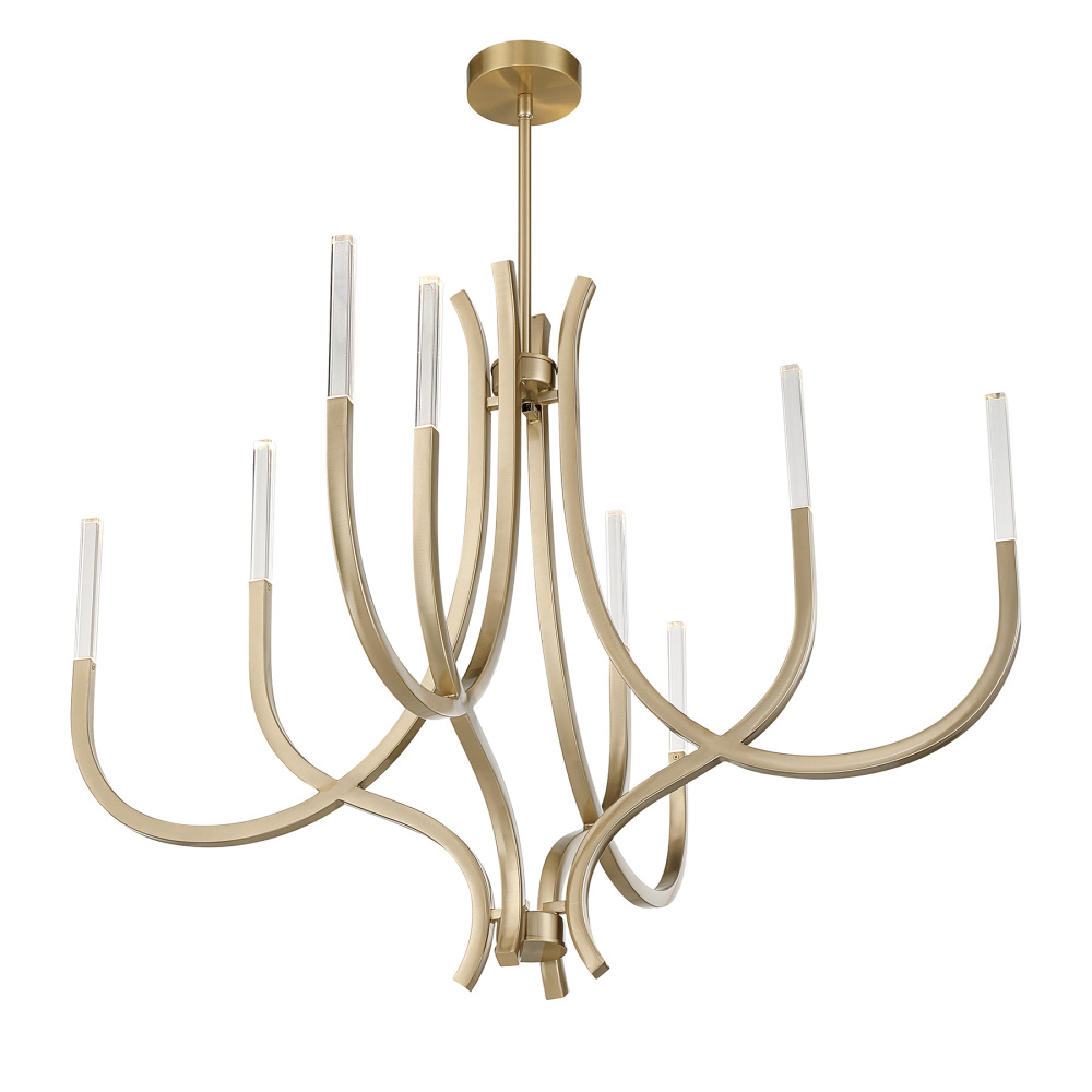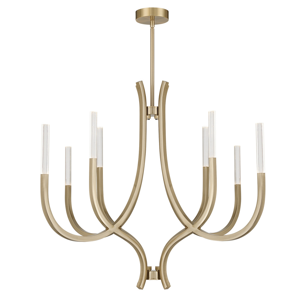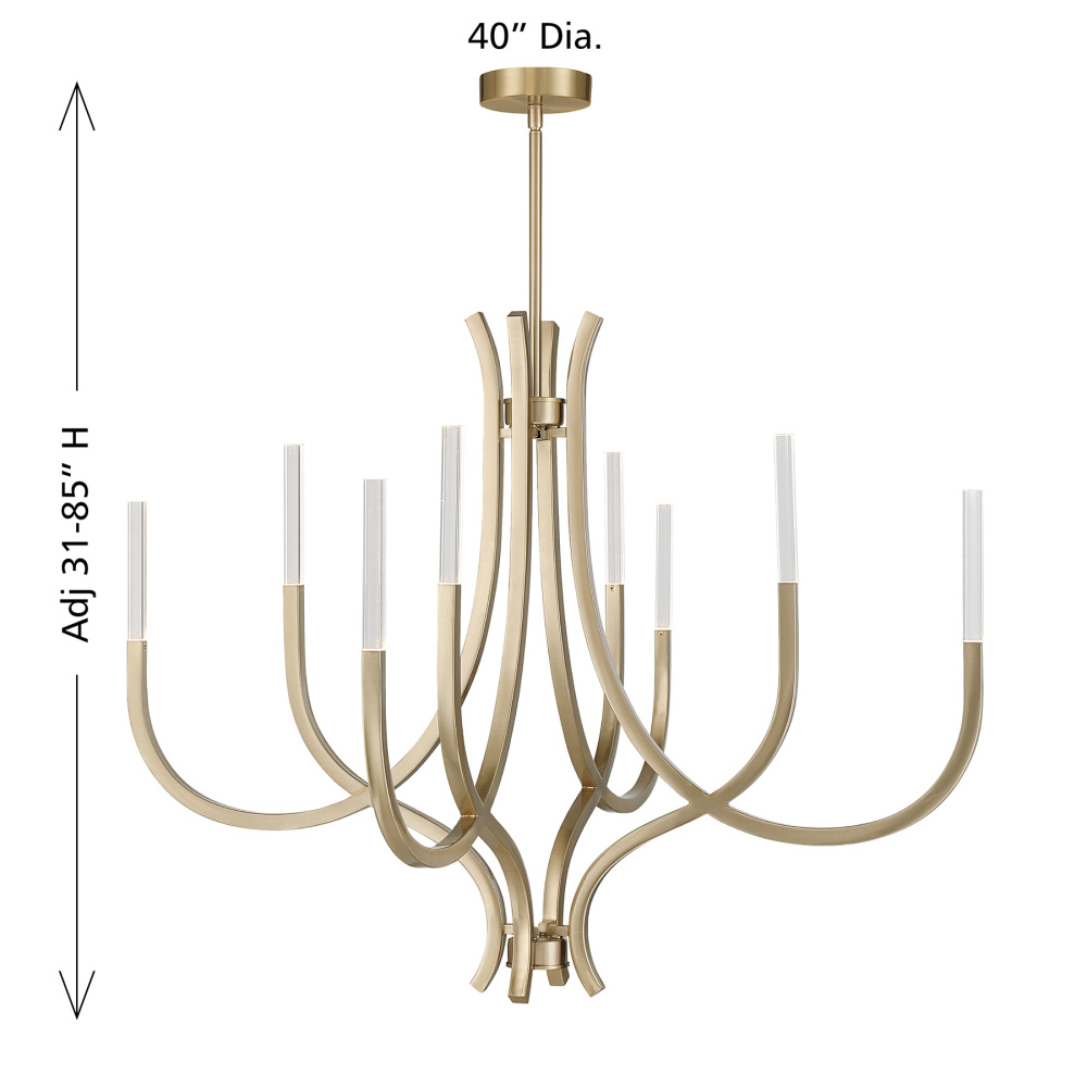 Gleaming and graceful, the Savoy House Bradford 8-light chandelier brings contemporary elegance to any room. Its sweeping arms and slender square glass columns create a balanced, architectural profile illuminated by integrated LED light sources. The Noble Brass finish amplifies the design’s brightness, giving it a clean, modern confidence. Bradford is 40" in width and offers an adjustable height from 33" to 81". It includes four 12" downrods and one 6" downrod for ideal hanging height. This polished, versatile look adds a sophisticated glow to dining spaces, foyers, and more.