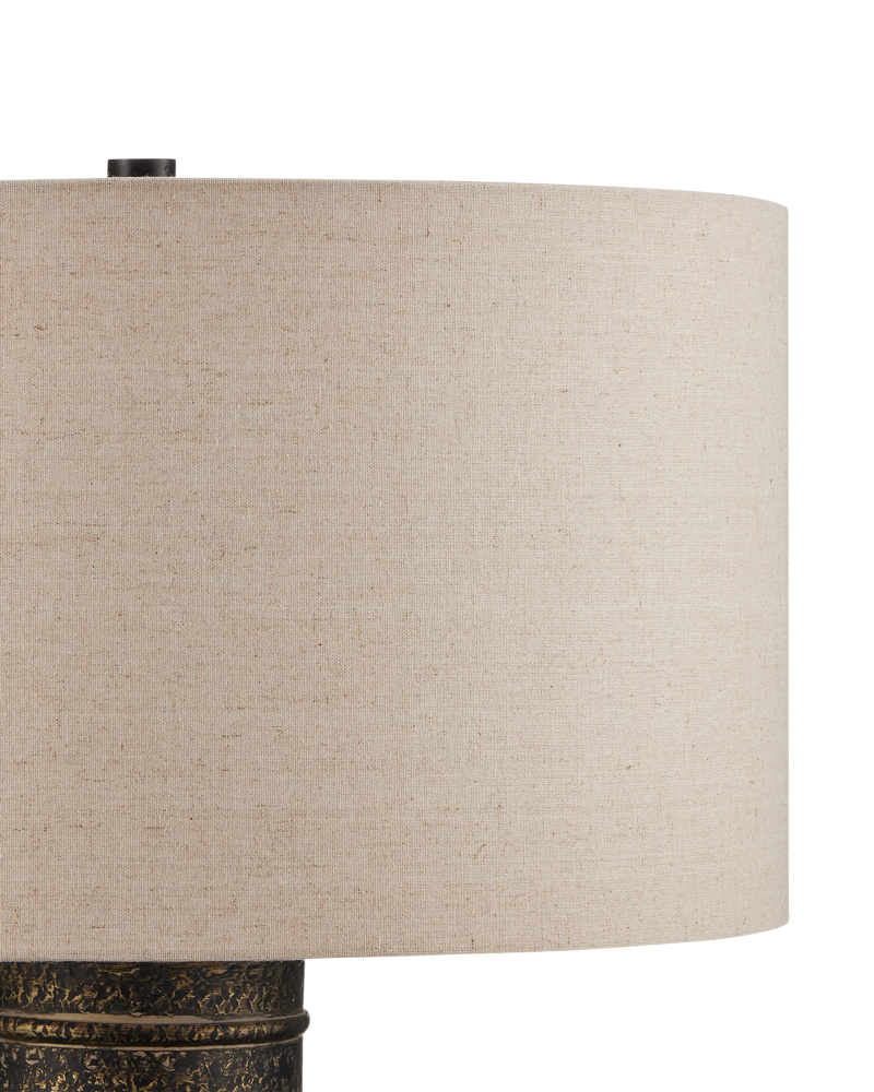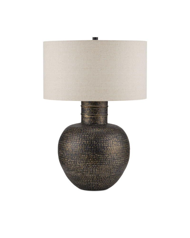 When rustic patina is desired, the Braille Table Lamp will deliver! Made of aluminum, the vase-shaped body has drifts of light and dark tones from the hand-applied antique brass finish that gathers in crevices and is wiped away from the hammered dimples that run along its surface. The raised rings on the neck of the lamp are a refined detail on the body that rises to meet the natural linen shade.
