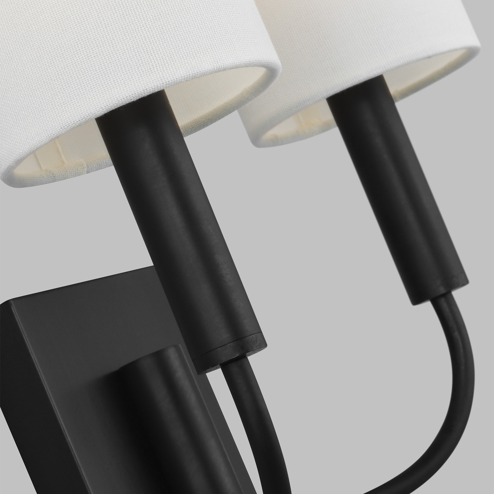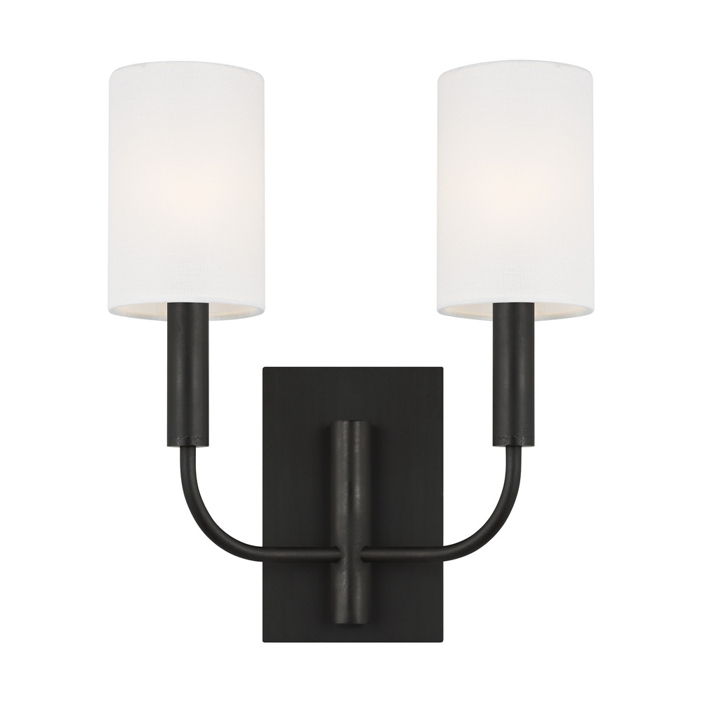 The Brianna two light wall sconce in aged iron offers shadow-free lighting in your powder room, spa, or master bath room. Brianna's graceful, seamless curvature and elongated tubular arms lend fluidity and modern appeal to this classic minimalist silhouette. Available in rich, gilded Burnished Brass and the more contemporary Polished Nickel finish. Brianna wall sconces include cylindrical shades in fresh White Linen.