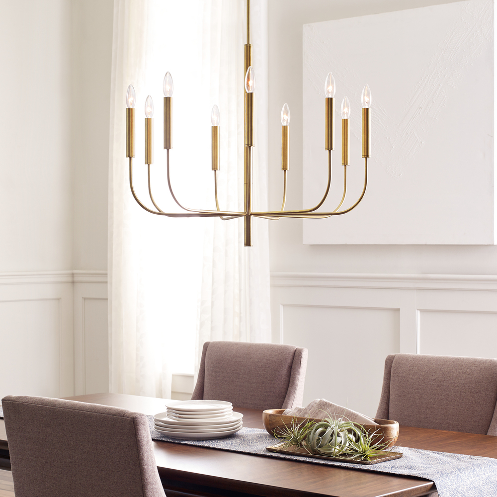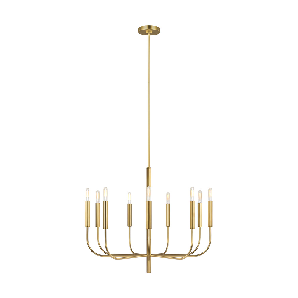 The Brianna nine light single tier chandelier in burnished brass provides abundant light to your home, while adding style and interest. Brianna's graceful, seamless curvature and elongated tubular arms lend fluidity and modern appeal to this classic minimalist silhouette. Available in rich, gilded Burnished Brass and the more contemporary Polished Nickel finish. Brianna wall sconces include cylindrical shades in fresh White Linen.