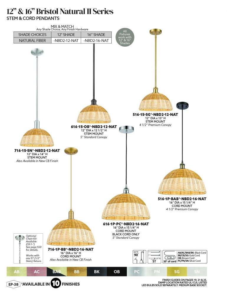 Innovations Lighting 516-1P-AB-NBD2-16-NAT - Bristol Natural II - 1 Light - 16 inch - Antique Brass - Cord hung - Mini Pendant