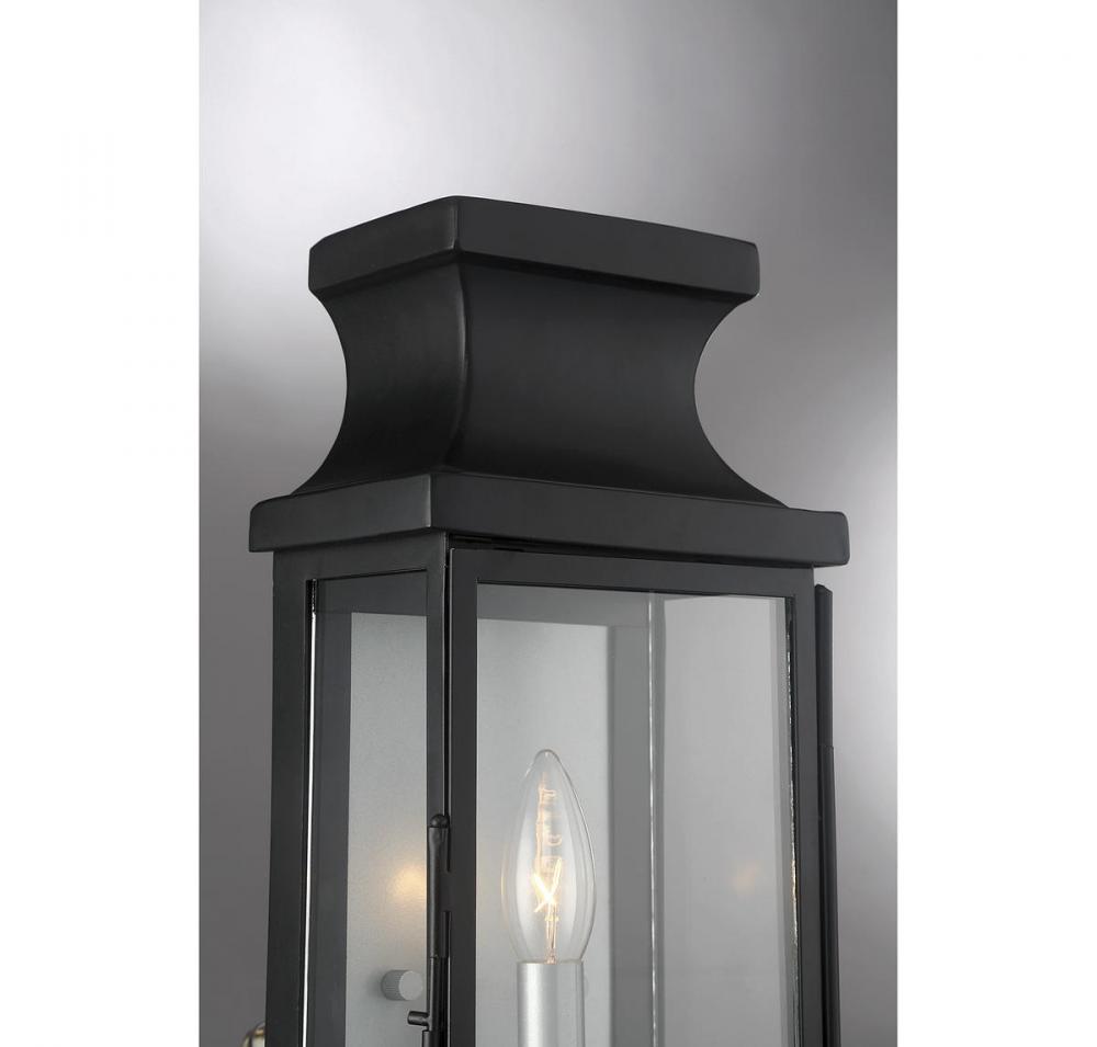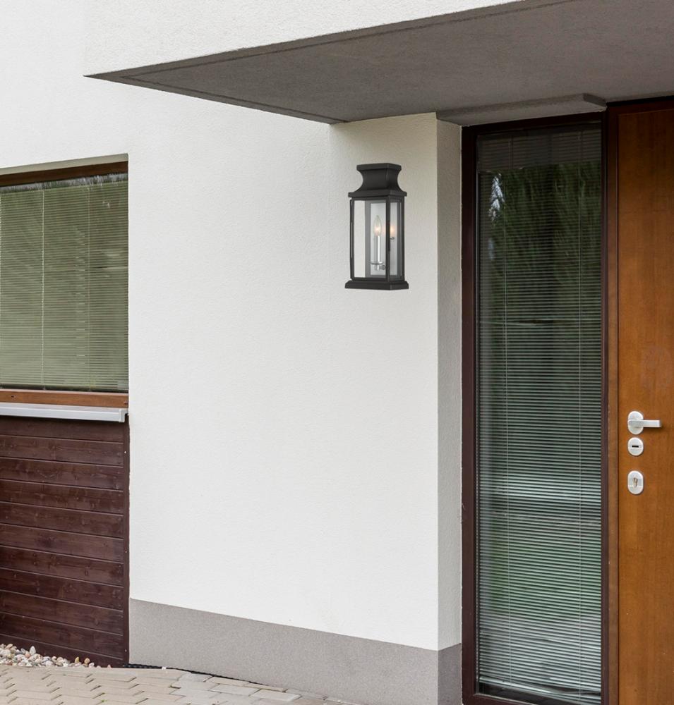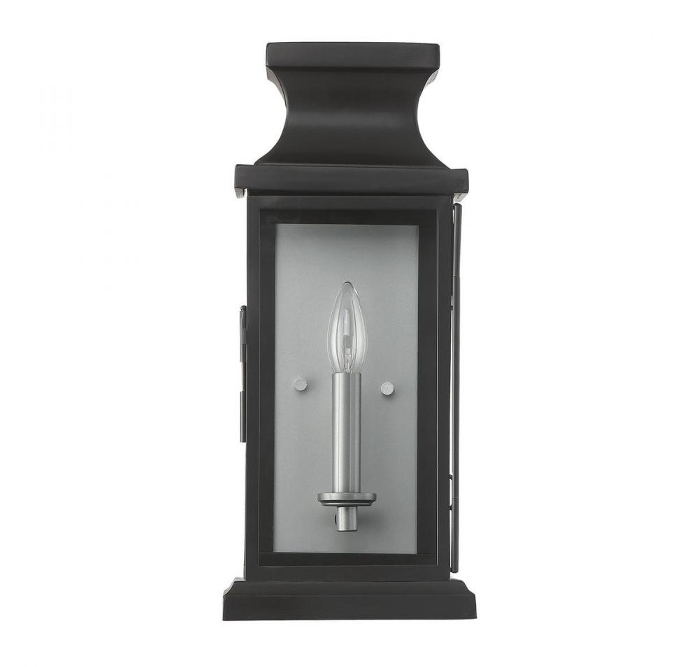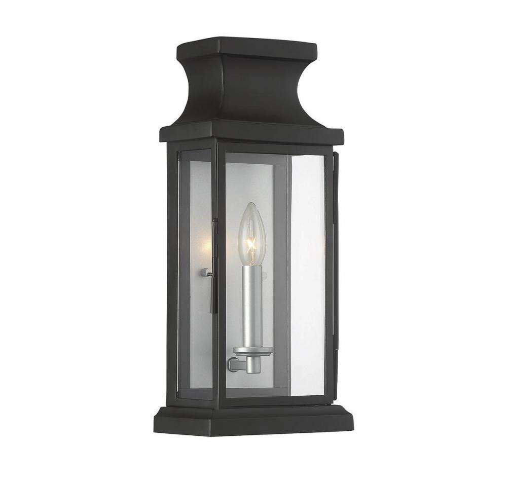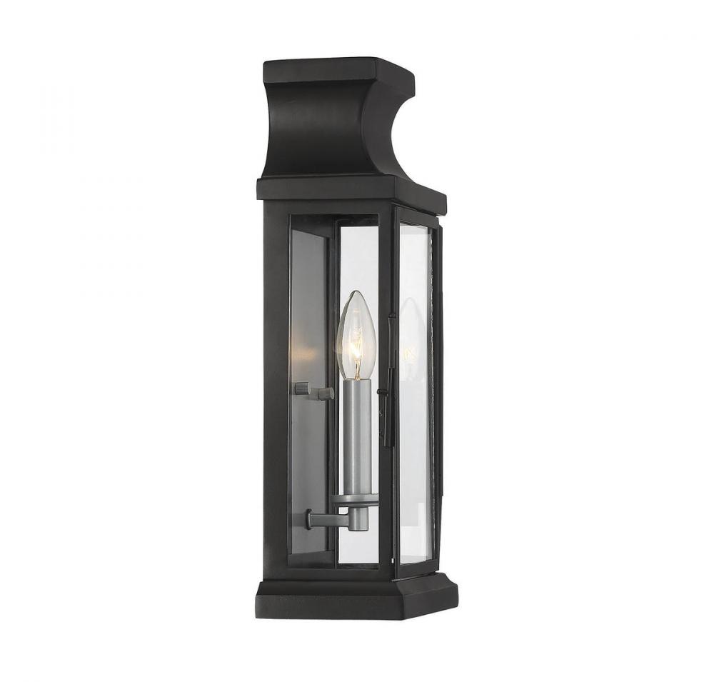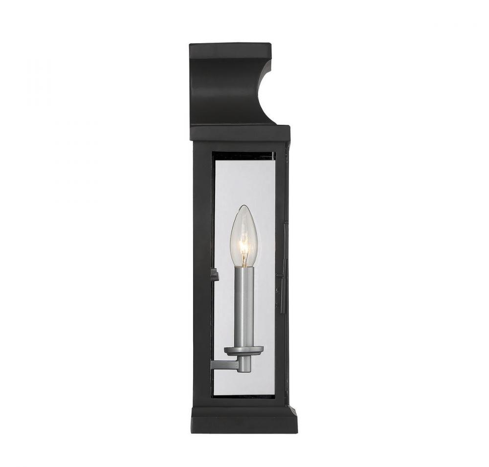 Welcome family and guests to your home in refined style. The Savoy House Brooke 1-light outdoor wall lantern has a streamlined traditional aesthetic for an uncluttered, polished look. The black finish looks great with everything and a slim, silvery candle tube adds a touch of simple luxury. The clean-lined, sculptural cornice has a classic shape and the rectangular frame has clear glass panels so a 60W candelabra size bulb can really shine. This lantern measures 7.25" wide by 17" high and extends 4.5" from the wall. It’s a graceful, traditional wall lamp made from high quality materials to provide you with welcoming light for many years.