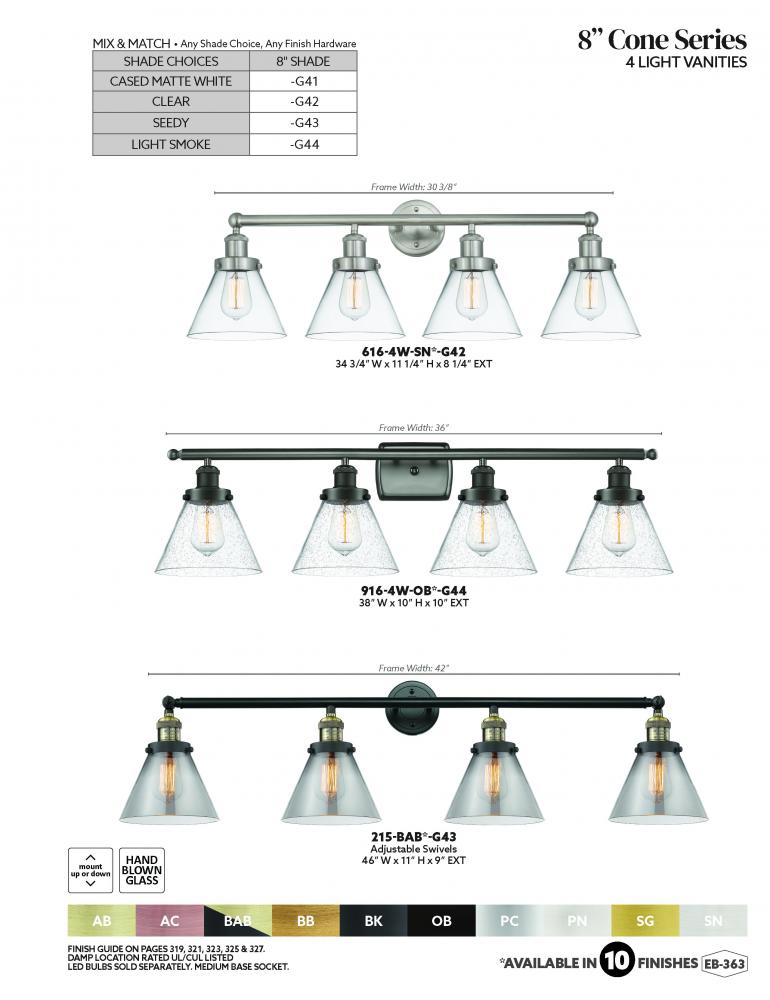 The Edison collection is comprised of heavy cast components that give the fixture a sturdy contemporary look. We offer the fixture in 11 finishes with a Bare Bulb look or with over 100 possible metal and glass shade options that can change the style to fit