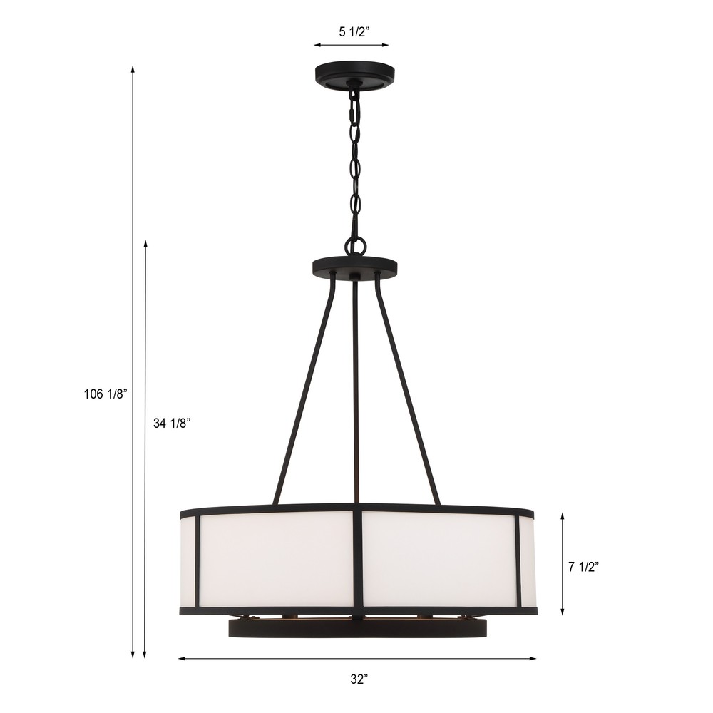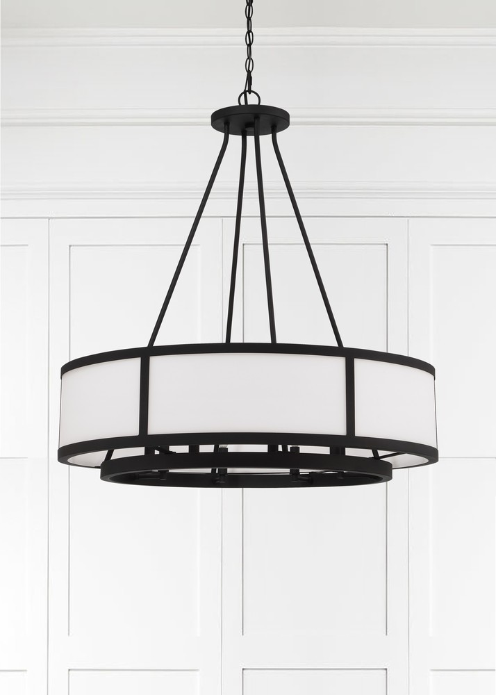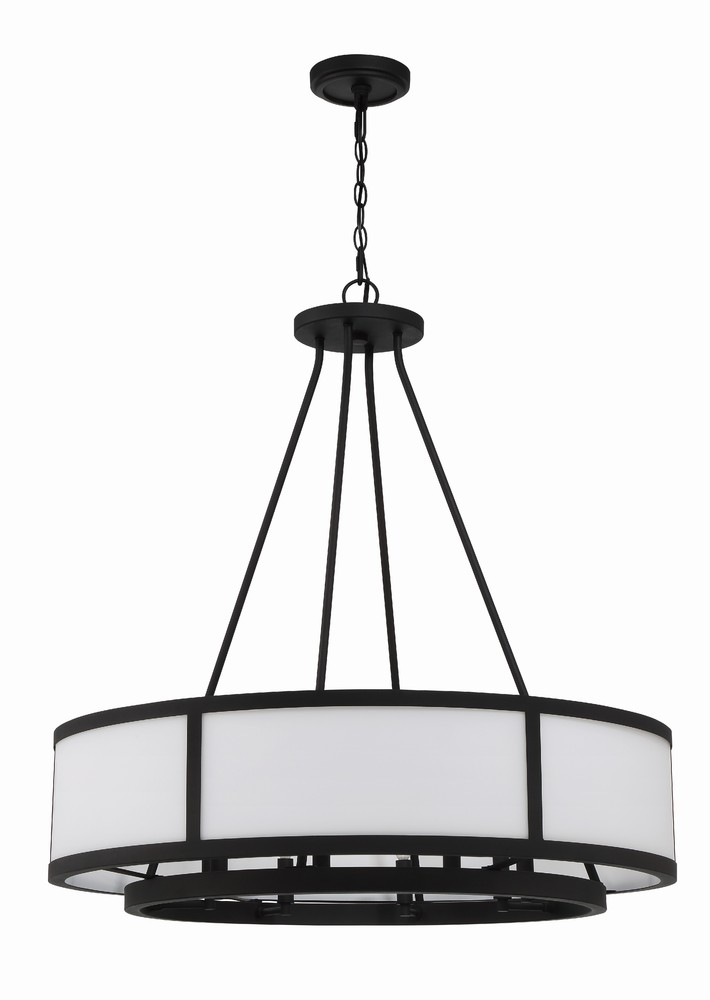 Showcasing a classic drum pendant, the Bryant is crafted with a white glass shade and black steel frame. The outer drum surrounds an inner suspension of candelabra sockets. The contrasting materials and bold graphic lines provide a design-driven style and a striking visual accent to many interior settings.