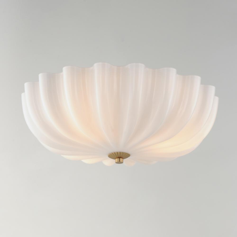 With glossy opal white glass shades, this collection brings a graceful, feminine touch to the inverted bowl design inspired by the shape of a bundt cake. Suspended by a decorative circular ring chain, the shade features an acrylic dust cover that encloses
