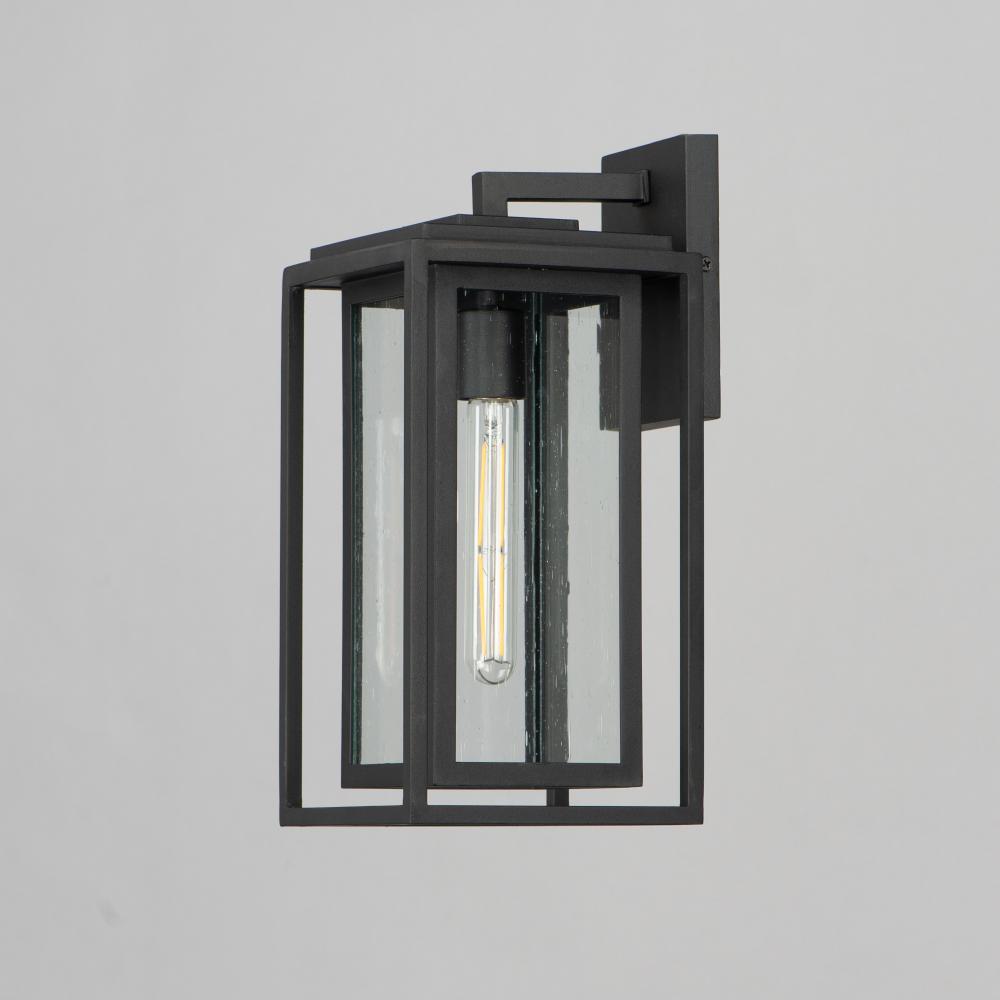A dual framed structure creates dimension on these outdoor lighting fixtures that is both contemporary and transitional. The construction consists of two frames of square tubing and squared components. The inner frame's Clear Seedy glass reduces gla