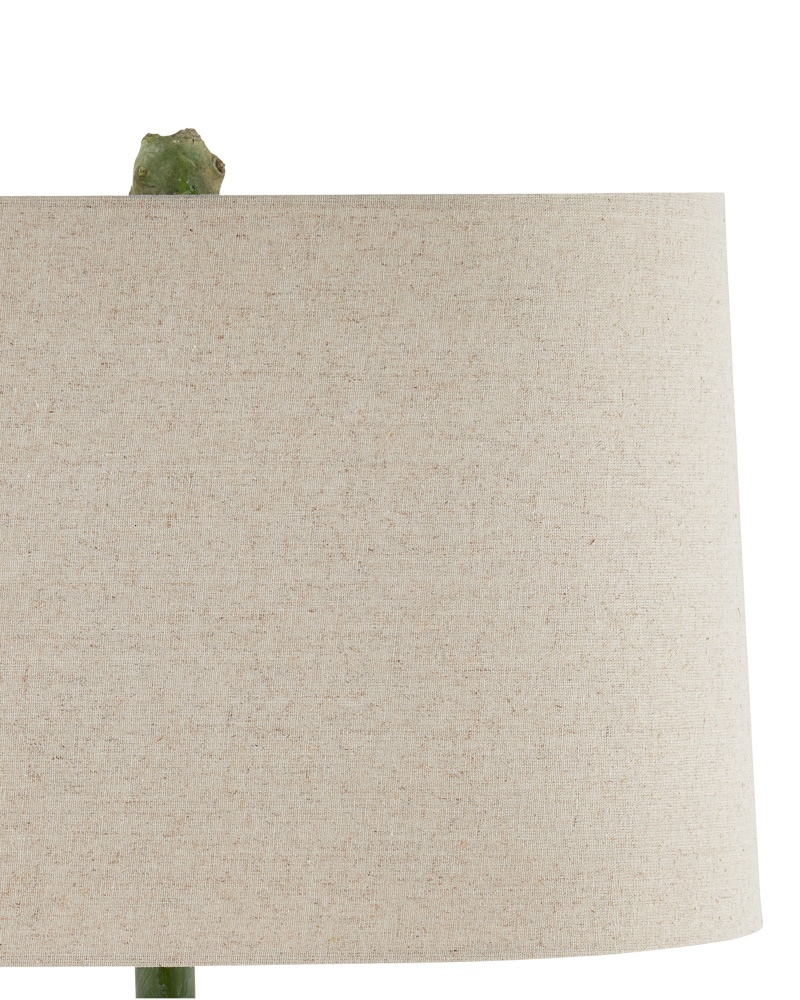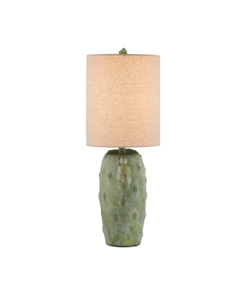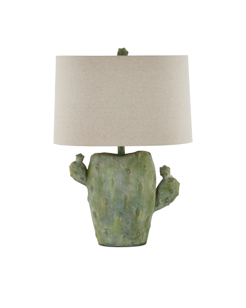 The Cactus Table Lamp has a slender oblong shape, making it great for spots where a lamp needs to sit closer to the wall. Made of made of composite to resemble concrete, it is slathered in varying shades of green for a verdigris ombré effect that looks aged. Because of this hand-applied treatment, the artisanal fixture will vary slightly from lamp to lamp.