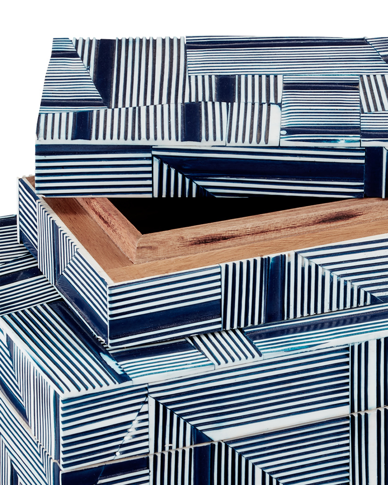 With bold patterns that match on all sides, the Cade Blue Box Set includes two nesting boxes that are made of solid wood covered in composite in blue and white patterns. The intermingling of thin and thick delineations creates a telescoping effect that brings the surfaces of these boxes the feel that they are in constant movement. The application is a painstaking one.