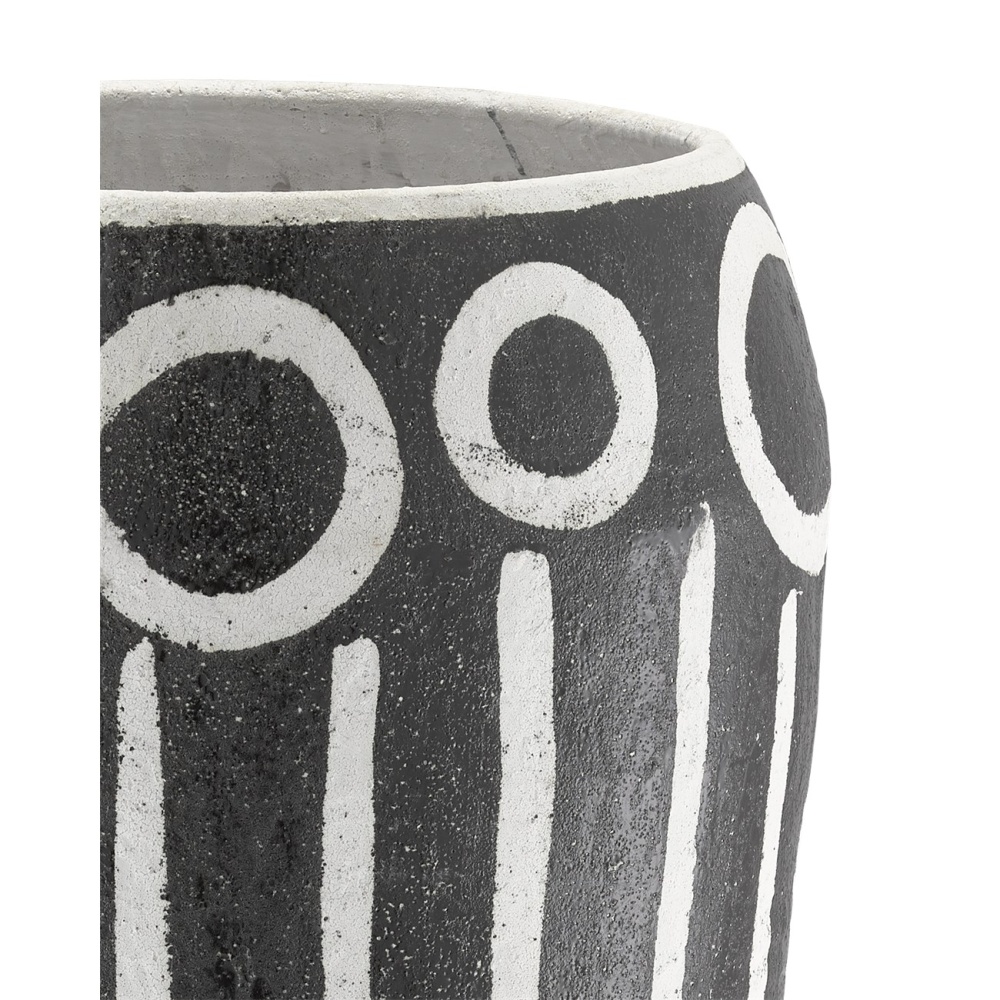 The Cairo Urn is made of hand-thrown terracotta with a surface treatment meant to bring the black and white urn powerful patina. The stripes along the surface are geometrically rich.