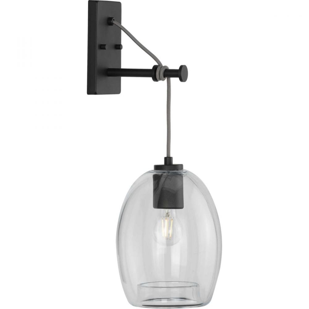 Infuse your home with the subtle industrial flair of this wall bracket. Inspired by the outstanding architecture of suspension bridges, the light fixture features a fabric cord that attaches to a beautiful graphite light base, smooth round bar, and rectangular backplate. A clear glass shade with a rolled rim at the bottom adds an extra touch of artisan inspiration.