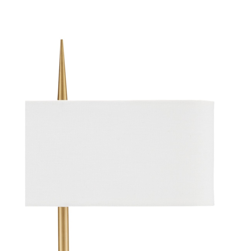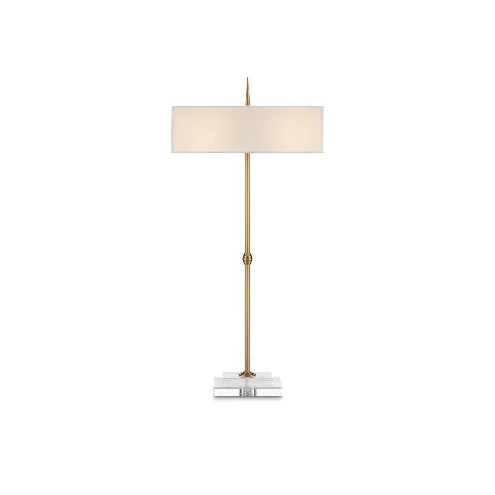 To celebrate the design prowess embodied in this piece, the Caldwell Table Lamp stands out as a classic design. The architectonic stem that composes the slim profile features a bee-hive ornament at its midpoint and culminates at the optic crystal base in three concentric rings that grow as they meet the stacked material. The pointed finial is a clever touch, as it looks as if the stem pierced the shade uninterrupted. Finishing the metal with an antique brass finish brings the gold table lamp warmth, as does the bone linen shade with its suave narrow profile.