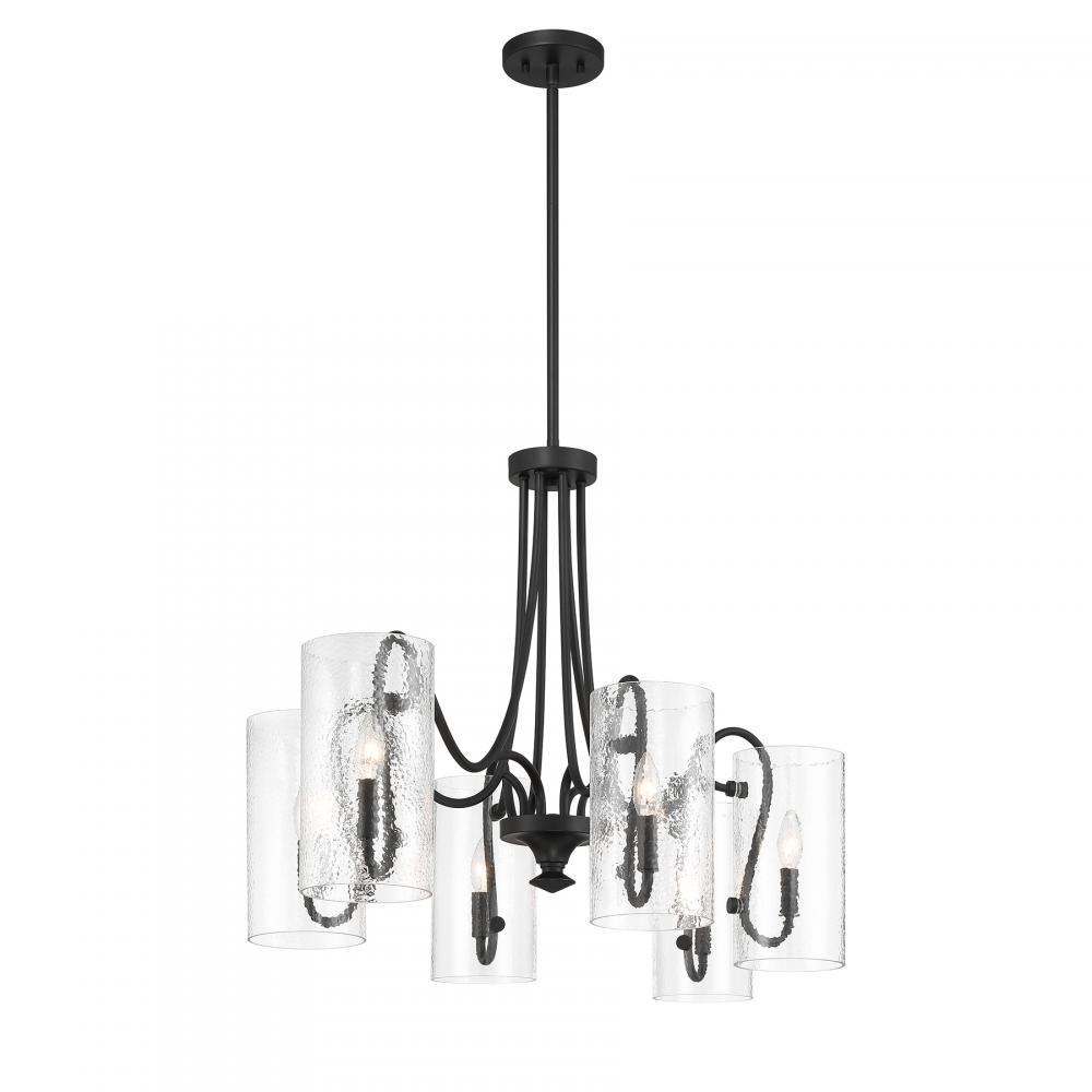 Heighten the drama with the Savoy House Calgary 6-light oval chandelier. Slim, boldly curling arms are each topped with a cool cylinder of clear hammered glass for added texture. Finished in Matte Black. Calgary is 48" in length, 25" in width and has an adjustable height ranging from 24" to 78", making it an excellent choice for illuminating large spaces. Comes with four 12" downrods and one 6" downrod. Uses six candelabra size bulbs of up to 60 watts per bulb. Bulbs not included.