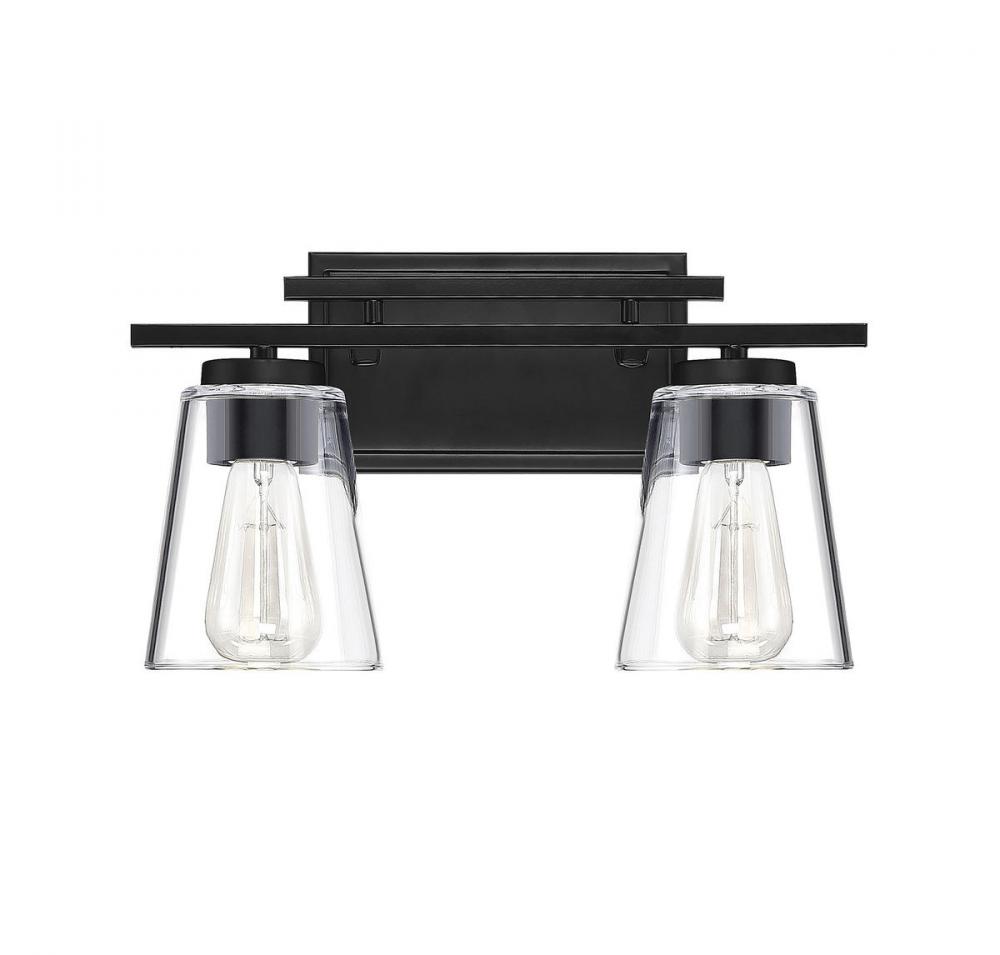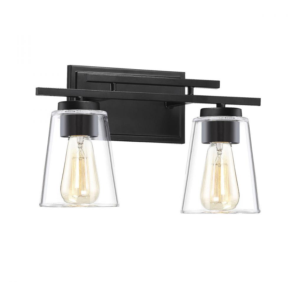 Brighten up your bathroom vanity with the sleek look of the Savoy House Calhoun 2-light bath bar. Its tapered clear glass shades and matte black finish make a perfect match. It may be mounted as either uplight or downlight. Bath bar lights are a classic choice for illuminating vanity mirrors in bathrooms big and small. Because the bulbs are exposed, try using stylized bulbs (not included) such as Edison for a different look! The matte black finish can be paired with black hardware or mixed with hardware in other fixtures. Calhoun is a smart choice for improving the lighting and look of any bathroom. When you choose a Savoy House lighting fixture, you can be certain you’ve selected a piece that will withstand the test of time.