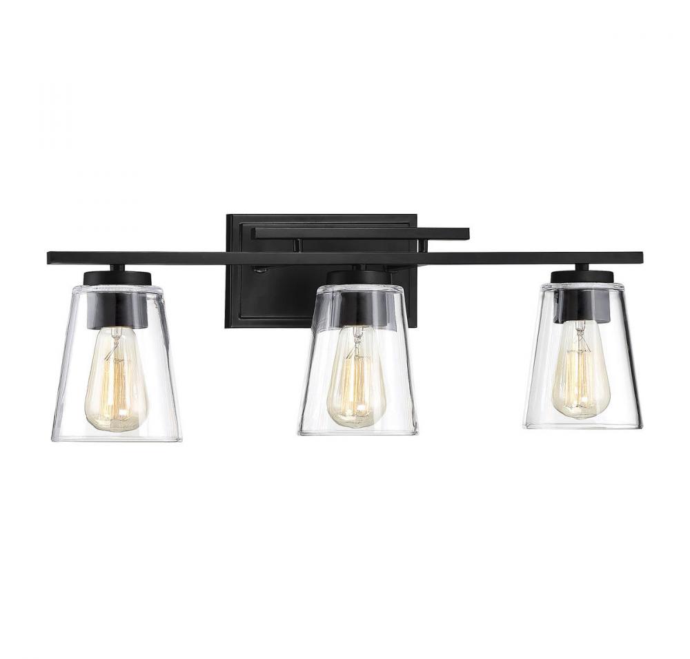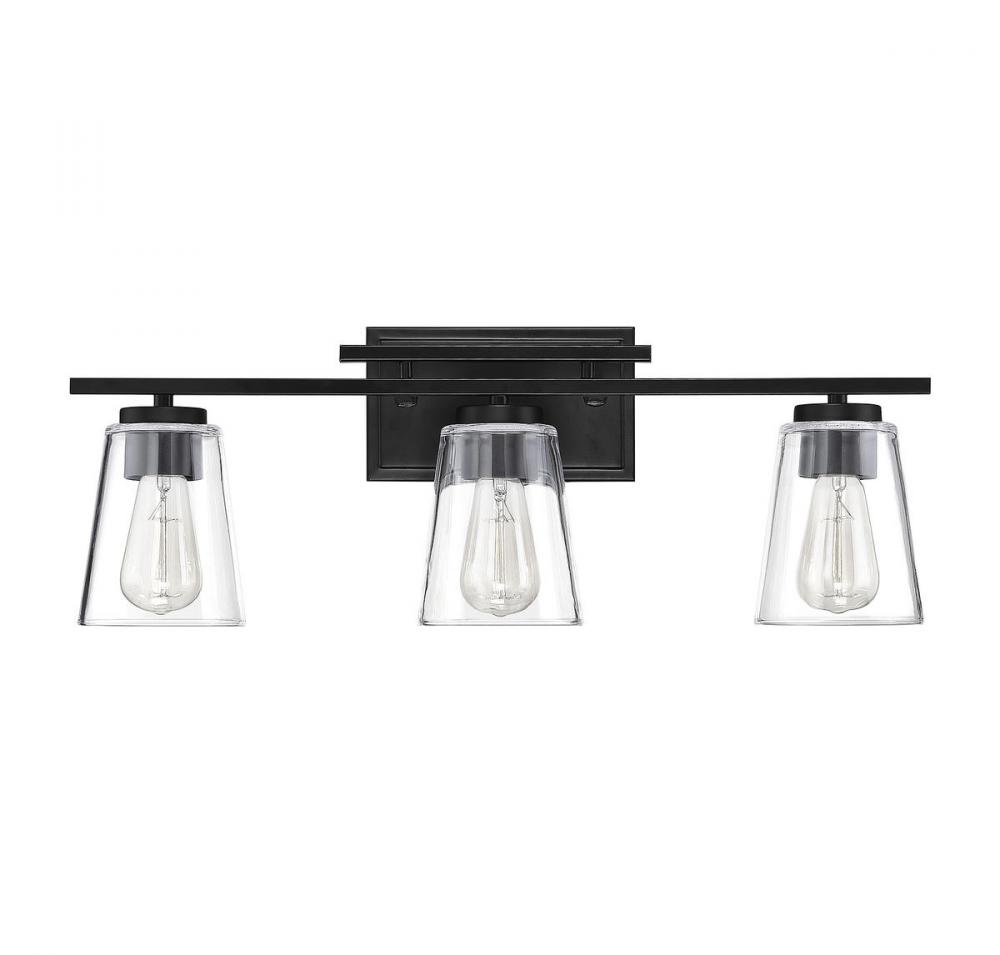 Brighten up your bathroom vanity with the sleek look of the Savoy House Calhoun 3-light bath bar. Its tapered clear glass shades and matte black finish make a perfect match. It may be mounted as either uplight or downlight. Bath bar lights are a classic choice for illuminating vanity mirrors in bathrooms big and small. Because the bulbs are exposed, try using stylized bulbs (not included) such as Edison for a different look! The matte black finish can be paired with black hardware or mixed with hardware in other fixtures. Calhoun is a smart choice for improving the lighting and look of any bathroom. When you choose a Savoy House lighting fixture, you can be certain you’ve selected a piece that will withstand the test of time.