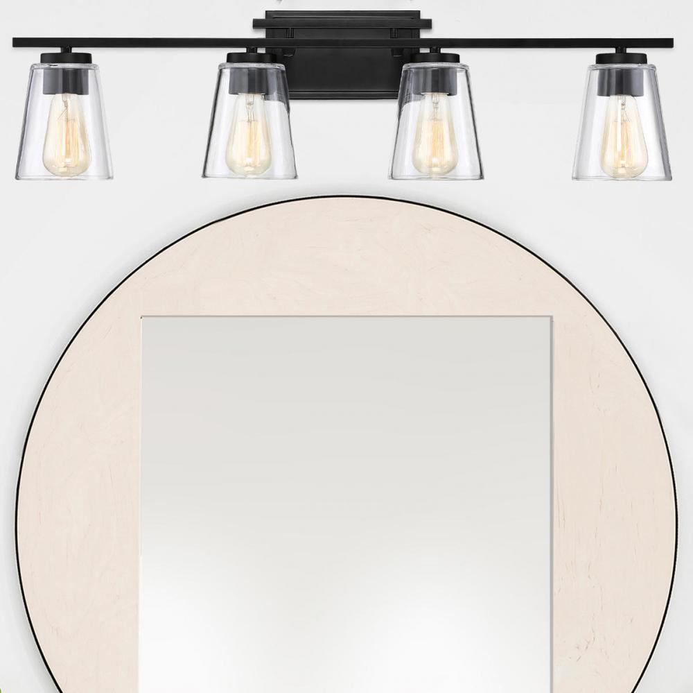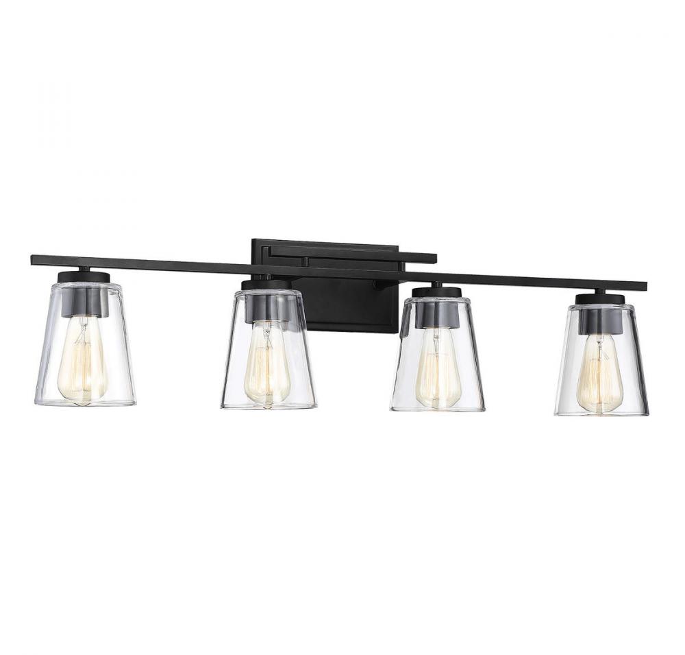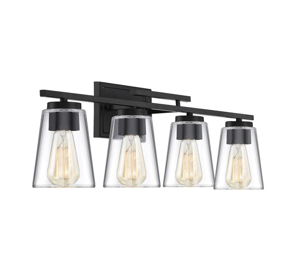 Brighten up your bathroom vanity with the sleek look of the Savoy House Calhoun 4-light bath bar. Its tapered clear glass shades and matte black finish make a perfect match. It may be mounted as either uplight or downlight. Bath bar lights are a classic choice for illuminating vanity mirrors in bathrooms big and small. Because the bulbs are exposed, try using stylized bulbs (not included) such as Edison for a different look! The matte black finish can be paired with black hardware or mixed with hardware in other fixtures. Calhoun is a smart choice for improving the lighting and look of any bathroom. When you choose a Savoy House lighting fixture, you can be certain you’ve selected a piece that will withstand the test of time.