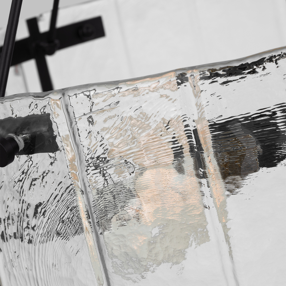 Clean and crisp, The Calvert series by Alexa Hampton is the perfect blend of function and beauty. Light flows freely through the Clear Textured glass shade while the rounded corners bring out the softness. Available as a medium chandelier with Aged Iron, Burnished Brass, or Polished Nickel finishes.