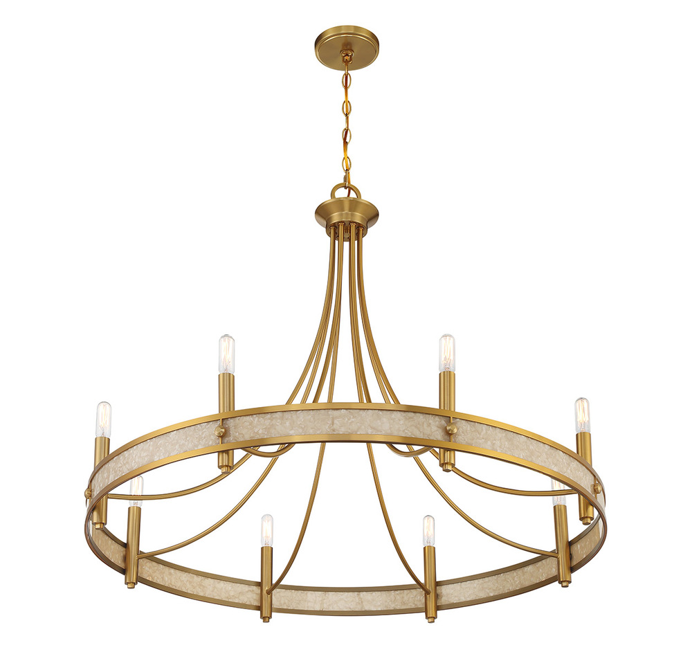 This brilliantly beautiful Savoy House Camden 8-light chandelier lets you bring a nature-inspired glow to your home. Shell accents with swirling patterns add a layer of wonder while the Warm Brass finish adds richness. Camden is 29" in height and 36" in width. Uses eight candelabra size bulbs of up to 60 watts per bulb. Bulbs not included.