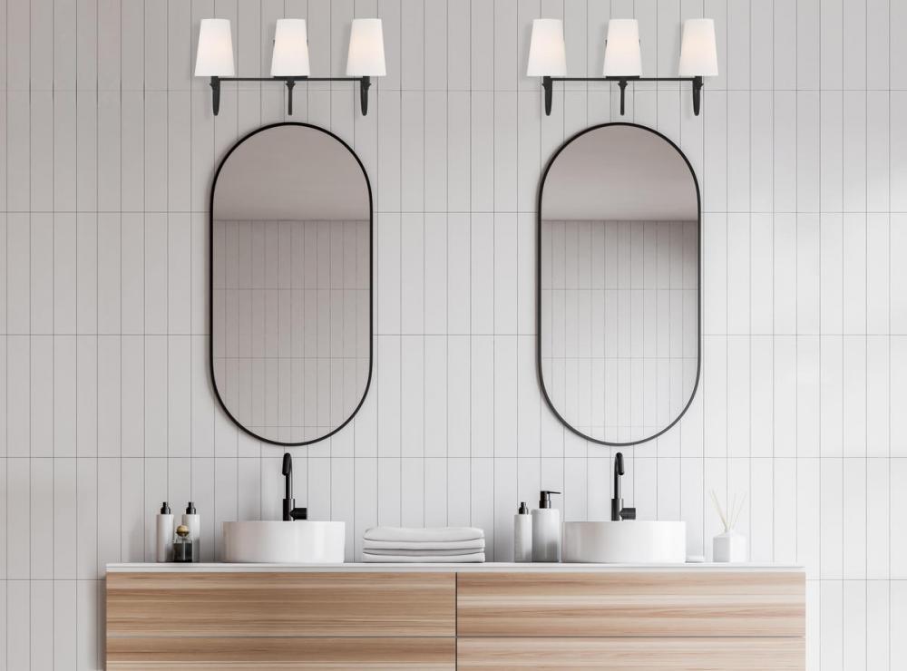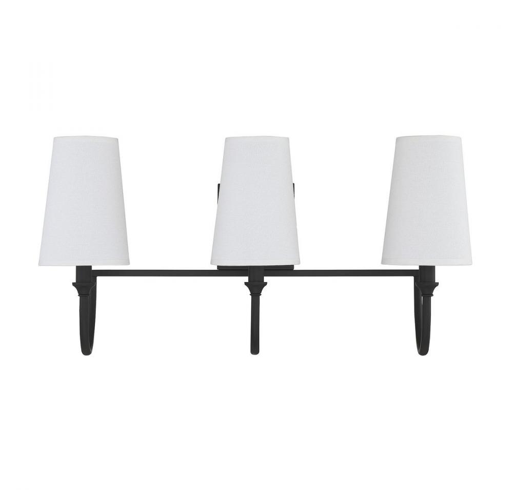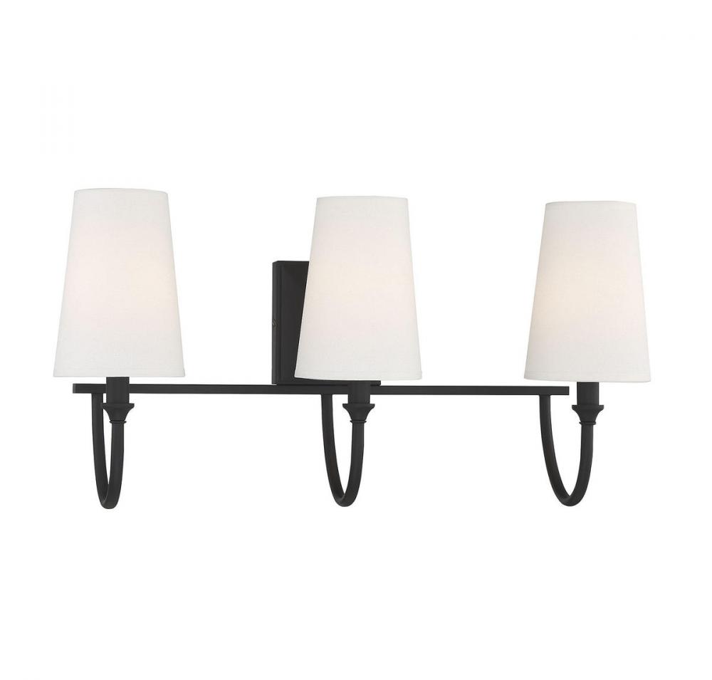 Bring the understated, classic beauty of the Savoy House Cameron 3-light bath bar into your home to create a thoughtful accent in any bathroom. This vanity light features slender, dramatically-curving arms topped with tall, tapered white fabric shades, ensuring a flattering glow. The faceted backplate adds another dimension of style, too. Finished in matte black. This fixture is 24" wide and 12" tall. It extends 8" from the wall. Uses 3 candelabra size bulbs of up to 40 watts each (not included).