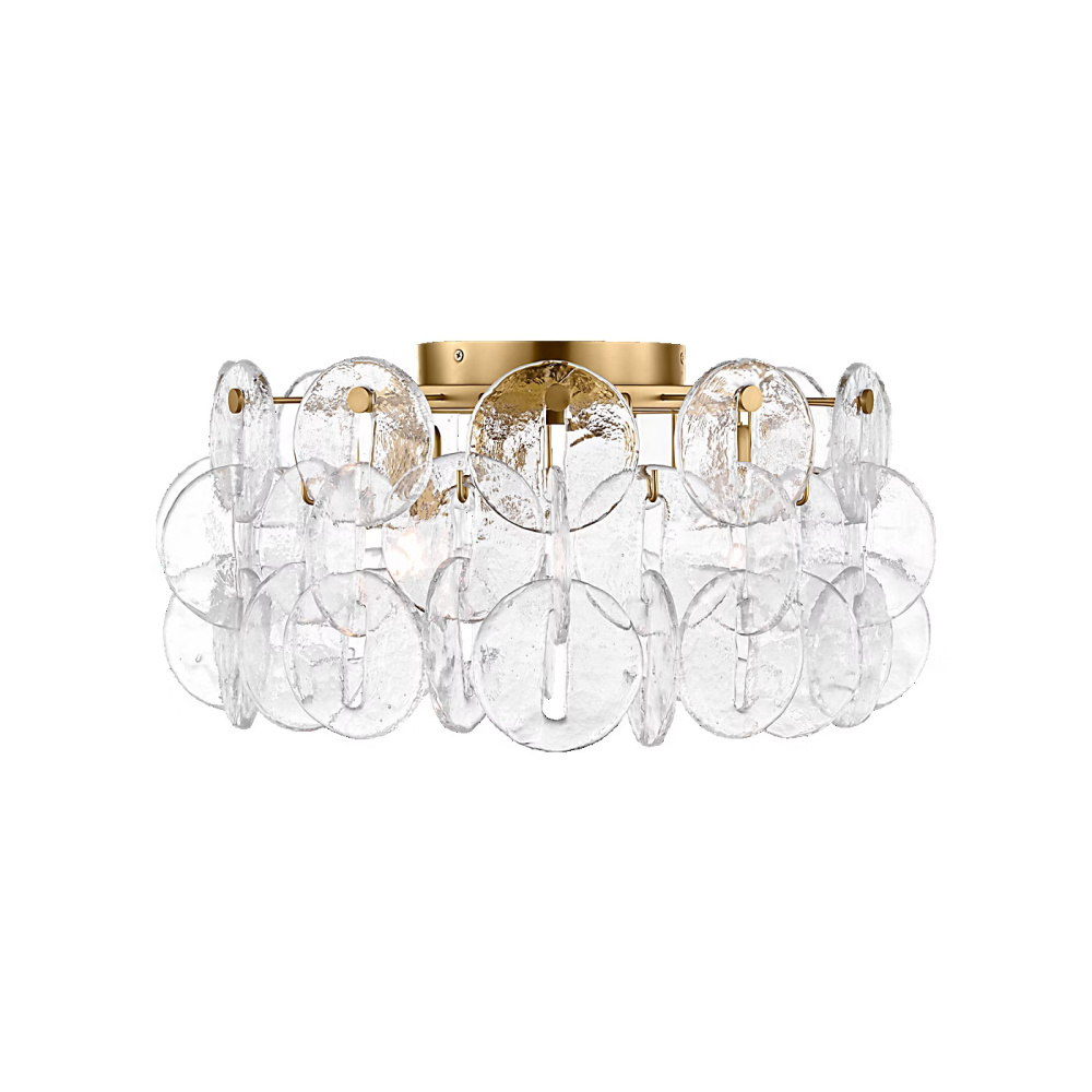 The Candace 21" Flush Mount by Kate Spade brings the collection’s layered glass artistry to spaces where ceiling height is limited. A sculptural arrangement of interlocking textured glass discs creates a low-profile cascade that diffuses light With warmth and subtle shimmer. Ideal for hallways, closets, bathrooms, and bedrooms, the 21" flush mount offers a refined, radiant presence that elevates everyday spaces With sculptural clarity and visual softness.