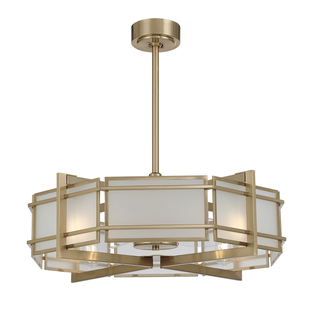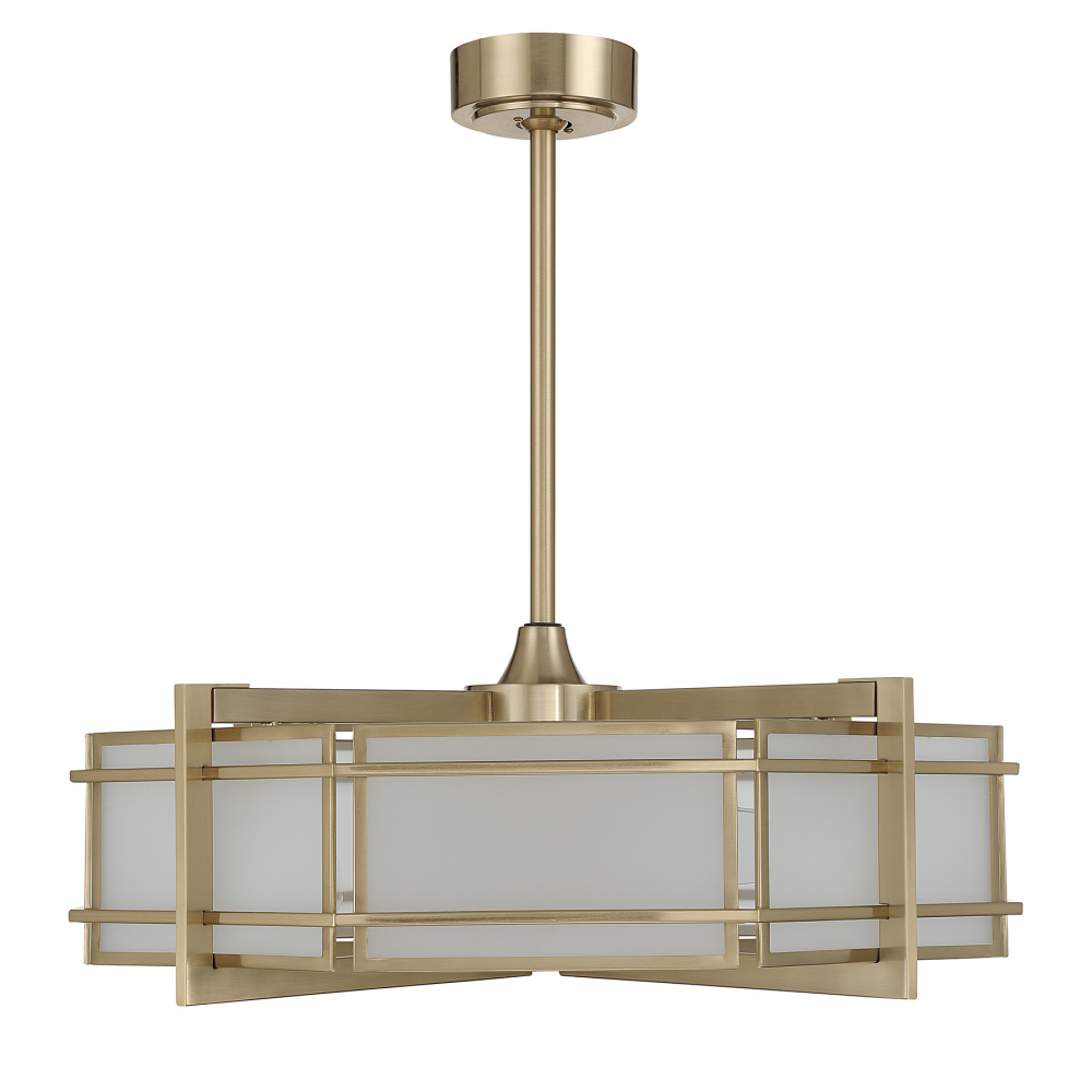Bring refined presence and refreshing comfort to your space with the Savoy House Canterbury Fan D’Lier. Frosted glass panels glow warmly against the Noble Brass finish, giving the design an elegant, Art Deco–inspired character. Four included LED bulbs provide bright and welcoming illumination while the quiet, efficient DC motor keeps air moving smoothly. A handheld remote offers effortless control over both fan and light. Canterbury is 29" tall and 30" wide and includes 4" and 18" downrods. As part of the Savoy House Fan D’Lier collection, it merges the sophistication of a chandelier with the everyday comfort of a ceiling fan to bring beauty and performance together in a uniquely stylish way.
