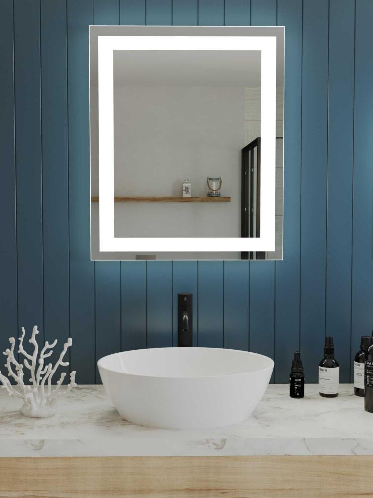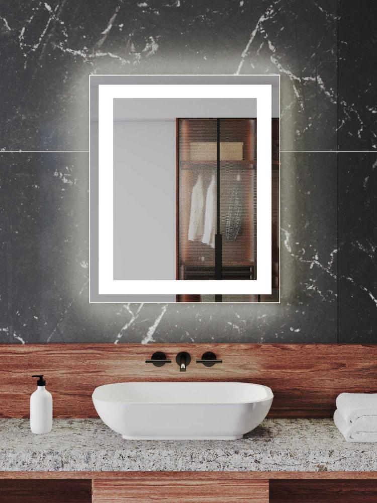 This rectangular LED illuminated mirror dramatically boosts the aesthetic of modern homes