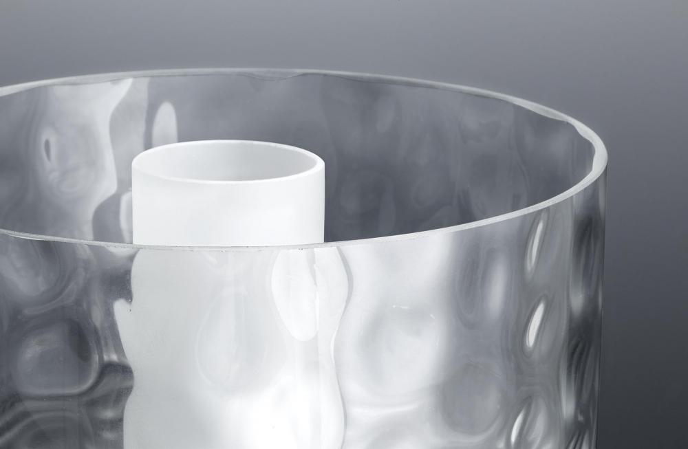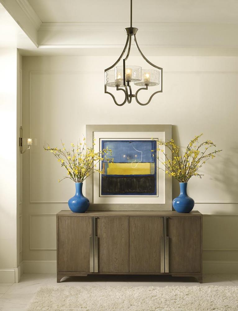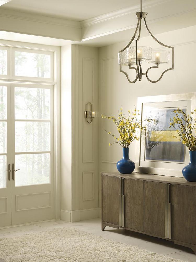 Three-light chandelier. Caress features a chic, sophisticated three-light chandelier featuring a Polished Nickel metal frame with layered glass diffusers to cast a glimmering light. An outer shade of clear, water glass adds rich texture and playful reflections from a central etched glass diffuser. Unique stem-hung construction carries the clean line all the way to the ceiling and, for sloped ceilings, 6 links of 9 gauge chain is provided to allow the fixture to hang straight and level. This fixture utilizes E12 based sockets so the bulbs are provided for your convenience.