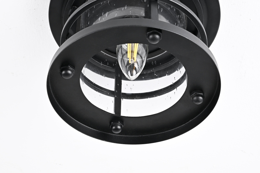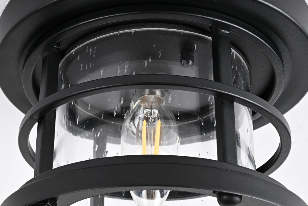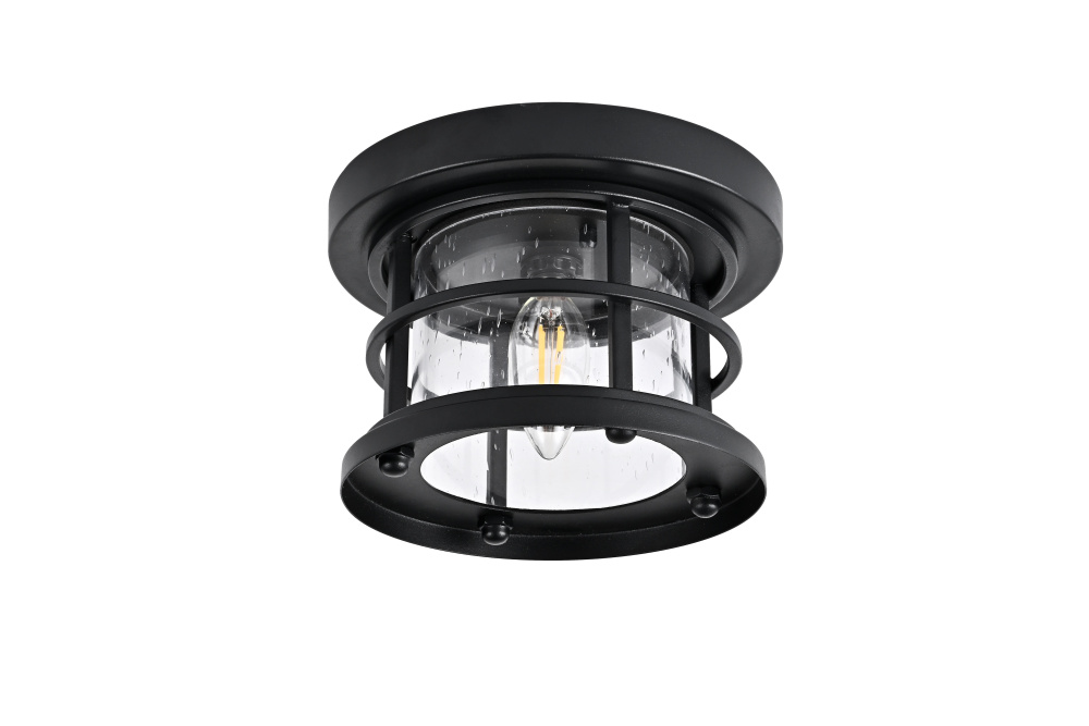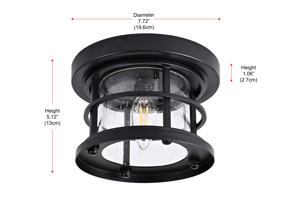 This outdoor flush mount light blends nautical and industrial influences, featuring a rounded frame with horizontal guard rails and a clear seedy glass cylinder for a structured yet functional look. The black-finished iron frame ensures durability, while the textured seedy glass enhances light diffusion, creating a warm, inviting glow. The open-bottom design allows for quick bulb changes, and the flush mount installation makes it a great choice for low-ceiling outdoor spaces such as covered porches, patios, and entryways. Designed for an E12 base bulb (not included), this fixture is also dimmable, offering adjustable brightness levels. ETL Damp Rated, this light is built to withstand moisture and outdoor conditions, making it a reliable and well-structured addition to any exterior setting. Built with marine-grade, corrosion-resistant aluminum, this sconce withstands coastal conditions for long-lasting durability.